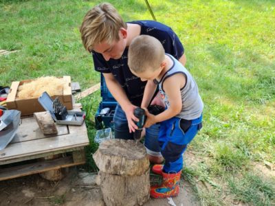 Für den zweiten Schritt teilten sich die Kinder zu Laura und mir auf. Die eine Hälfte begann mit Laura das Holz auf die richtige Länge zu sägen, während die andere Hälfte mit mir (Kim) zusammen die ersten Löcher in eine große runde Holzscheibe bohrte. Dafür nutzen wir verschieden große Bohrer im Durchmesser von drei bis sechs Millimeter. Verschiedene Insektenarten bevorzugen verschieden große Löcher für ihre Behausung. Von drei bis fünf Millimeter ergibt ein solches Loch eine ideale Behausung für die blattlausfressenden Wespenarten, während sich ab fünf bis sechs Millimeter die Mauerbiene pudelwohl fühlt. Dadurch können wir viel mehr Arten ansprechen und ihnen unter die Arme greifen.
