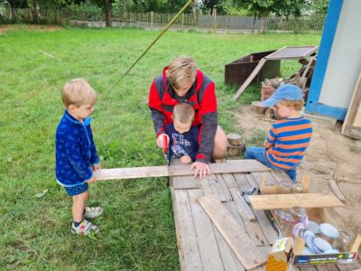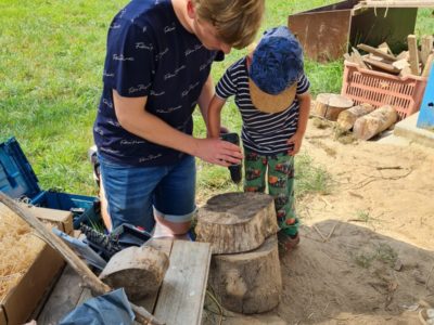 Die Kinder teilten sich selbstständig auf, einige halfen beim Vermessen, andere gingen lieber spielen und wieder andere halfen beim Sägen.