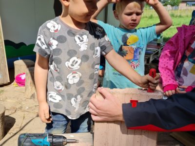 Danach verabschiedeten wir uns von Sönke und er ging zurück in die KiTa. Unseren Fallschutz für die Materialien bauten wir aus Hasendraht und nagelten diesen an das Hotel an. Bis zur Hälfte schlugen Henrietta, Karl, Emil und Kalle die Nägel und bogen diese dann einfach um.