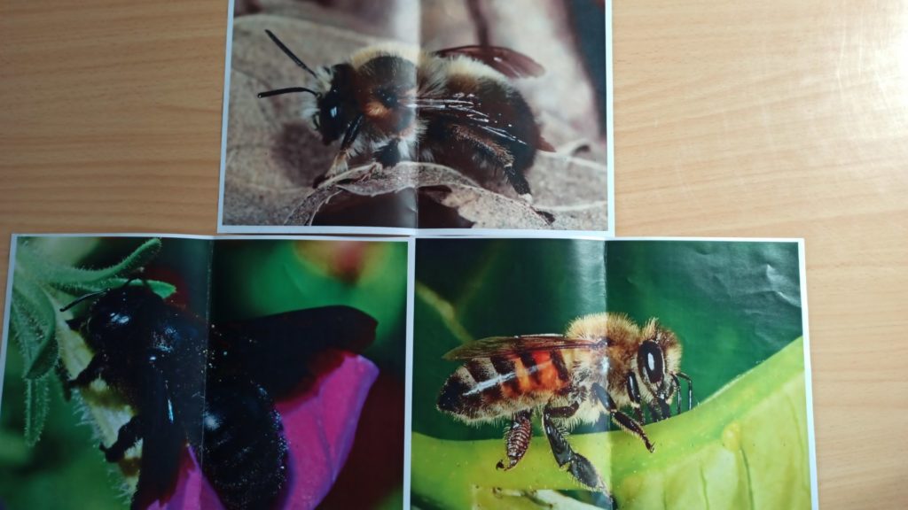 Danach sind wir nochmal auf die Farbgebung der Bienen eingegangen und wir zeigten den Kindern drei Bilder von verschiedenen Bienen: der Honigbiene, der Holzbiene und der Pelzbiene. Während die Honigbiene die klassische gelb-schwarze Färbung aufweist, sind die anderen beiden Arten deutlich dunkler gefärbt. Durch ein Ratespiel errieten die Kinder die Namen der Bienen und erzählten viele Infos, die sie bereits über die Bienen wussten (z.b. „die geben Honig!“) Henry (5 Jahre) und Piet (5 Jahre) errieten die Pelz und Holzbiene. Dementsprechend waren die beiden auch stolz wie Oskar (und haben auch allen Grund dazu!)