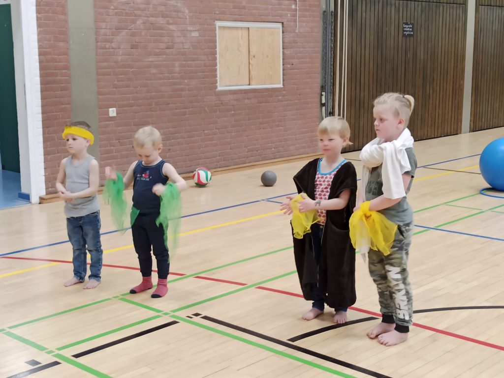 Dafür sind wir in unsere kleine Sporthalle neben dem Kindergarten gegangen und haben uns zuerst so richtig ausgetobt! Danach haben wir einen Kreis gemacht und den Kindern von unserem Vorhaben erzählt. Die Stimmung war zu diesem Zeitpunkt noch sehr gemischt und eine leichte Skepsis lag in der Luft. Laura trug die kurze Geschichte vor. Es ging hierbei um eine durstige Biene, die sich und ihren Freunden den Regen wünschte. Wir besprachen die Rollen und fragten nach Freiwilligen. Es gingen zuerst nicht alle Hände nach oben, doch mehr als genug, um das Theaterstück starten zu lassen. Kim ging mit den Schauspielern in einen Nebenraum, verkleidete sie und besprach die letzten Fragen der Kinder.