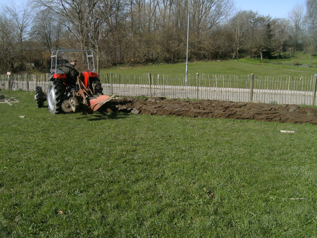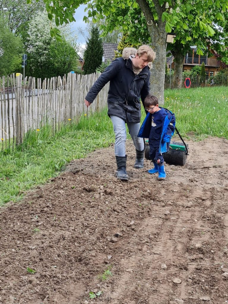 Da die Arbeit mit vielen Personen nicht möglich war, mussten wir auf die Hilfe von Maschinen zurückgreifen. Am Donnerstag, den 16.04.2021 war es dann soweit. Gemeinsam mit Henry, Karl, Mattis und Ute bin ich um 11 Uhr zu unserer Wiese gegangen. Mit lautem Knattern und Brummen kündigte er sich schon an. Diederich Diedrichsen oder auch kurz – Didi kam mit einem kleinen Traktor auf unsere Wiese gerollt. Hinter ihm ein kleiner Pflug gespannt, mit dem er die Erde bei uns mächtig aufwühlen wollte. Bei genauerer Betrachtung war uns die Fläche von 25 Quadratmetern doch ein bisschen zu „lütt“. Didi sagte so viel wie:“ Ich pflüg da zwei-dreimal drüber und dann ist das schon eine gute Fläche!“ Gesagt getan und so wurden unsere geplanten 25 Quadratmetern zu großzügigen 60 Quadratmetern. Anstelle von grüner Wiese ragten nun dicke braune Erdschichten aus dem Boden. Didi gab unseren Kindern auch eine Aufgabe: Die Kinder sollten alle Grassoden auf den Kopf drehen und festtreten. Eifrig machten sich die Kinder ans Werk und sammelten nebenbei noch ganz viele Regenwürmer für ihre Lupengläser. Jetzt ist die Erde noch sehr grob und dick. Am Freitag den 23.04.2021 kam uns Didi erneut besuchen und wühlte in unserem Beet herum, sodass dies nun bereit für die Aussaat ist.
