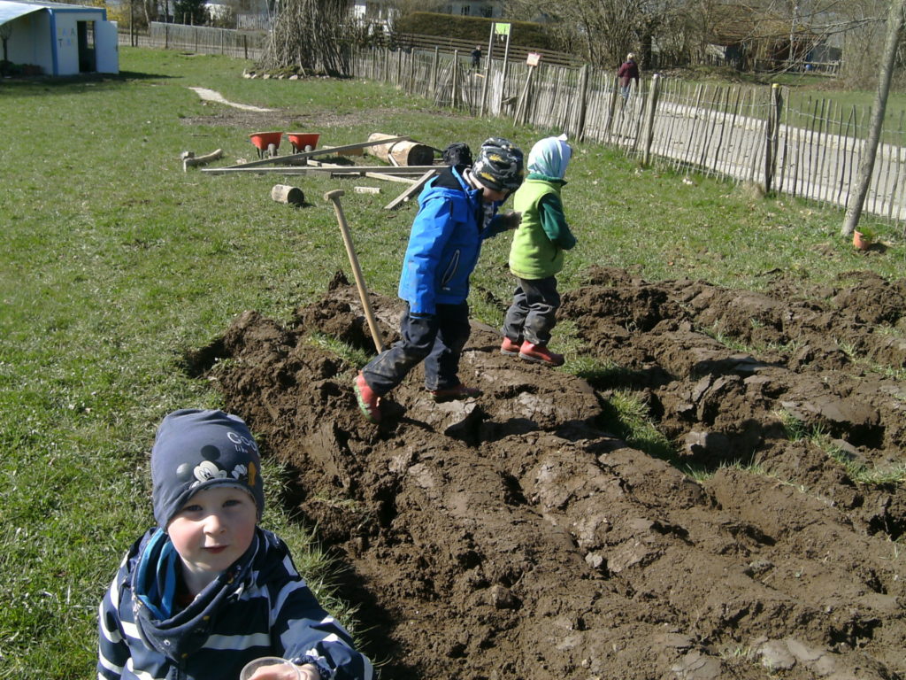 Schließlich kam unser großer Tag. Zuvor hatten wir die „wunderschöne“ Aufgabe das gröbste Unkraut aus dem Beet zu entfernen – endlich war das Feld bereit für die Aussaat. Mit unserer Hacke trennten wir unser Beet in viele ein Quadratmeter große Flächen. Wir versammelten die Kinder und jedes Kind durfte sich ein Quadrat aussuchen und seine Saat verteilen. Zu Beginn herrschte leichte Ratlosigkeit, da kein Kind so wirklich wusste wie man nun diese Tüte auf dem Viereck richtig verteilt. Nach unserem Ratschlag „stellt euch einfach vor, das ist eine riesengroße Pizza und ihr wollte diese mit einer Menge Käse an allen Seiten bestreuen.“,denn Kinder und Pizza waren schon immer eine gute Kombination und so legten die Kinder richtig los, bis auch das letzte Fleckchen mit Saat bedeckt wurde.