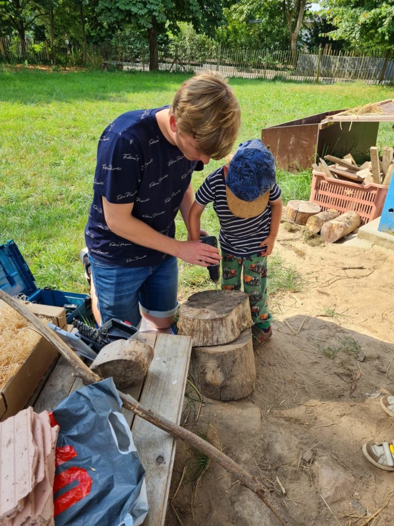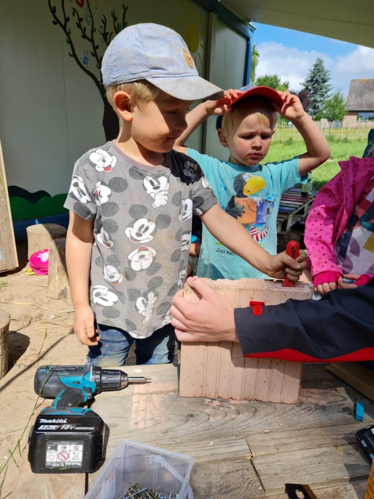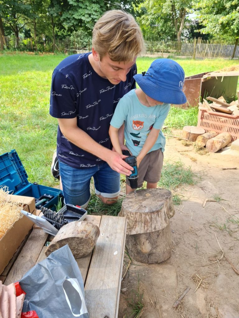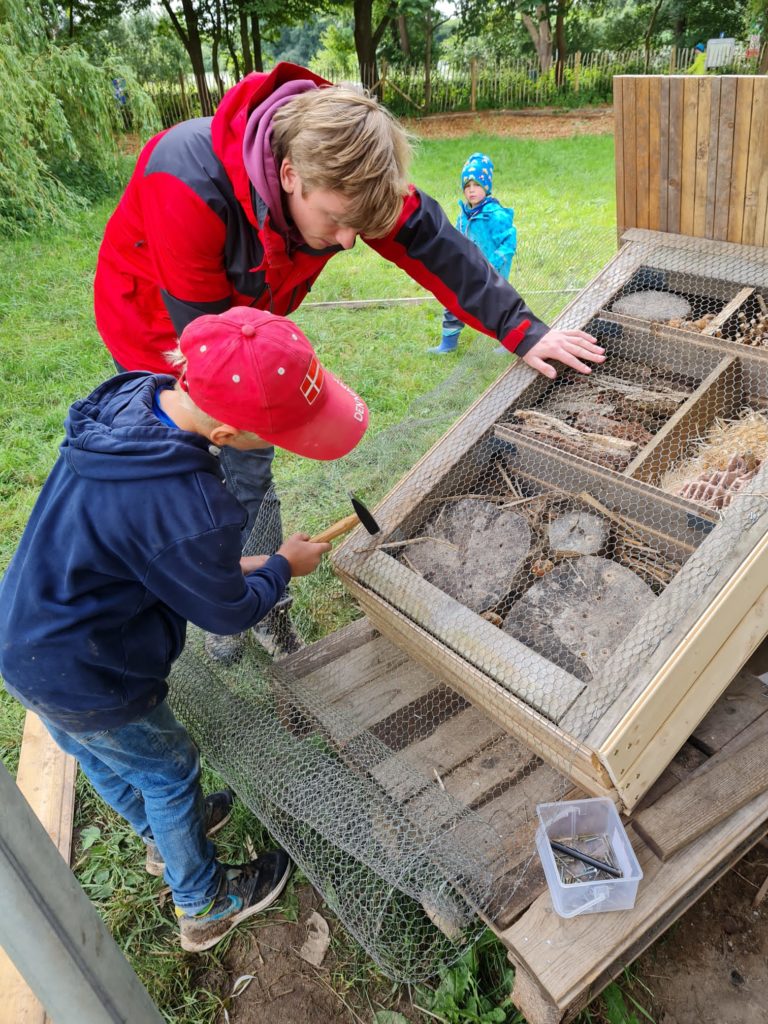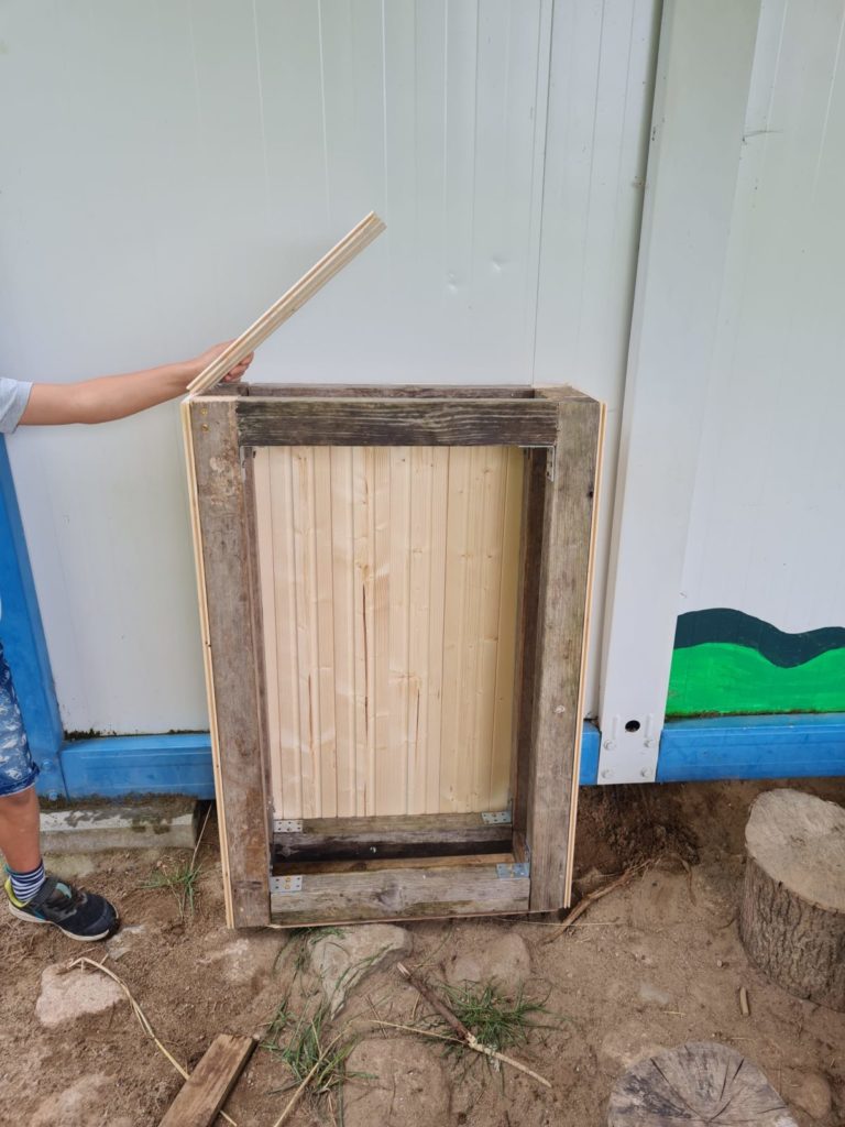 Mit vereinten Kräften wurden dann die Bretter fein säuberlich in das Insektenhotel verschraubt. Besonders Filo, Henry, Felix und Emil waren eine riesige Hilfe dabei und versenkten eine Schraube nach der anderen im Holz.
