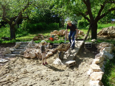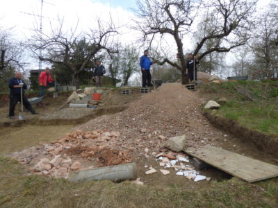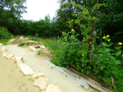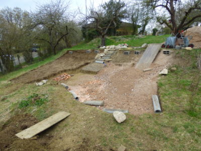 Insgesamt wurden ca. 60 cbm Material auf der Fläche von den 31 Gestalter*innen händisch(!), d.h. ohne Maschineneinsatz, bewegt. Am 13.03.2021 erfolgte der 1. Spatenstich um zuerst ca. 30 cm tief fetten Mutterboden abzutragen, anschließend wurden ca. 30 cm gebrochener Bauschutt eingebracht und als oberste Schicht nach Errichtung einer Trockenmauer mindestens 30 cm ungewaschener und lehmhaltiger Sand verfüllt. Im unmittelbaren Umfeld wurde Magerbodenweg angelegt, der hauptsächlich mit Sedumpflanzen geimpft wurde und flächig zuwachsen soll. Aus dem Aushub entstand eine sanft modellierte Hügellandschaft, die intensiv mit Stauden und Wiesensaat bepflanzt wurde. Im nahen Umfeld wurde die bienenfreundliche Durchwachsene Sylphie als Beispiel für eine Energiepflanze mit ökologischen Vorteilen belassen. Am 23.07.2021 fand das Projekt nach vorherigem punktuellem Pflanzimpfen mit dem weiteren Aussäen einer einheimischen Blühmischung am großen Aushubhügel sein vorläufiges gestalterisches Zwischenergebnis für den Pflanzwettbewerb. Es geht also noch weiter . . .