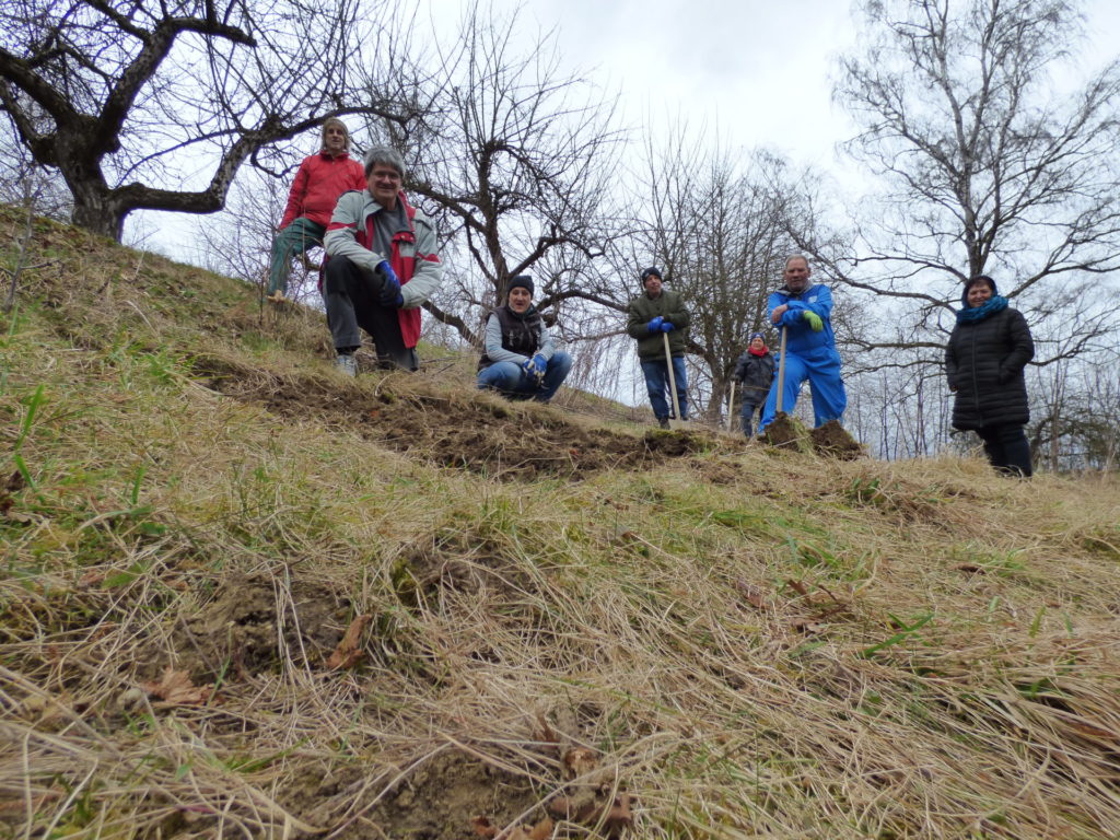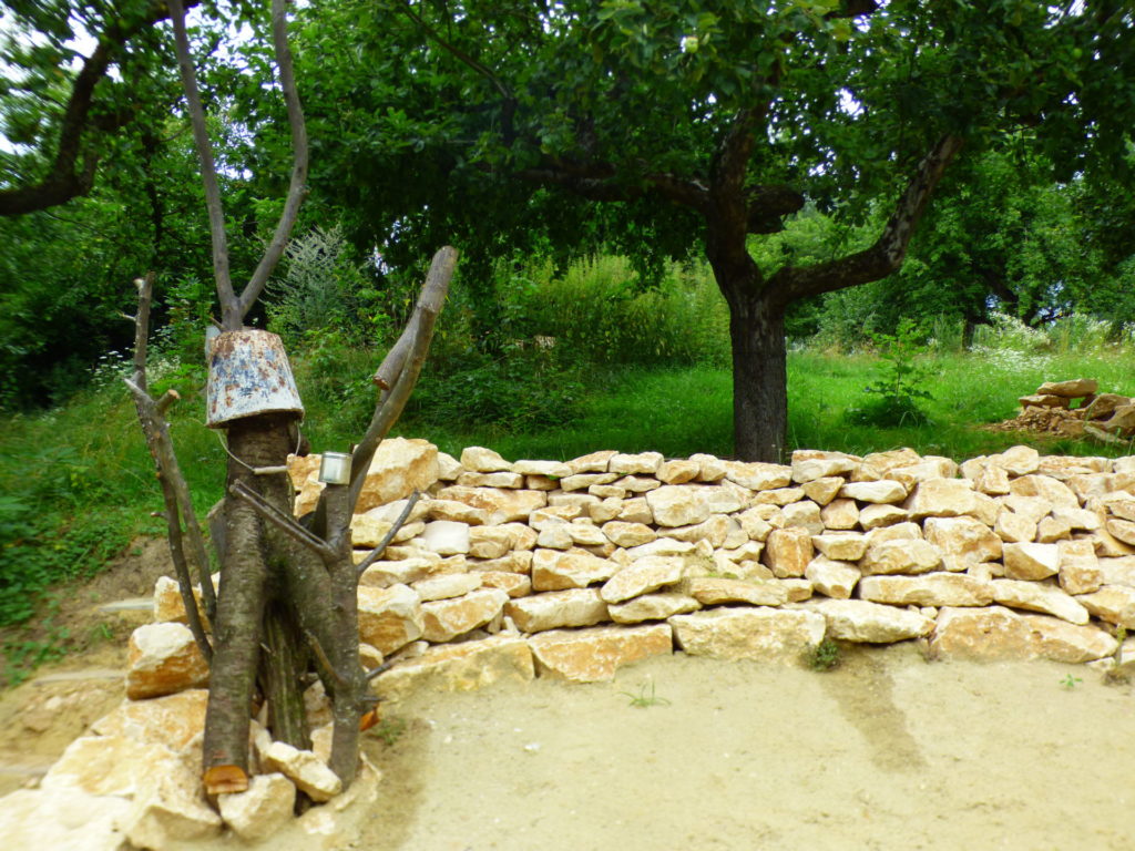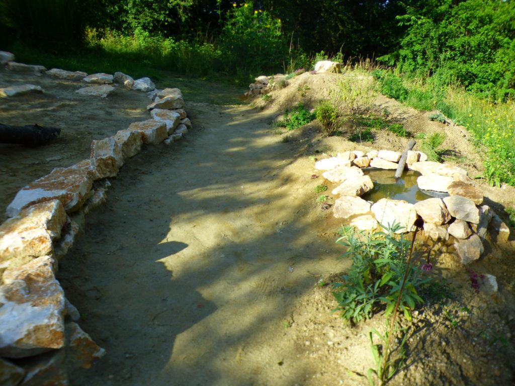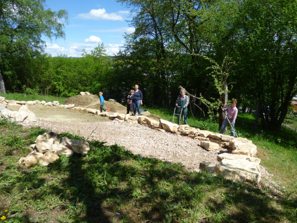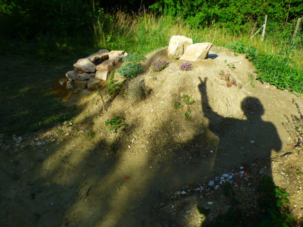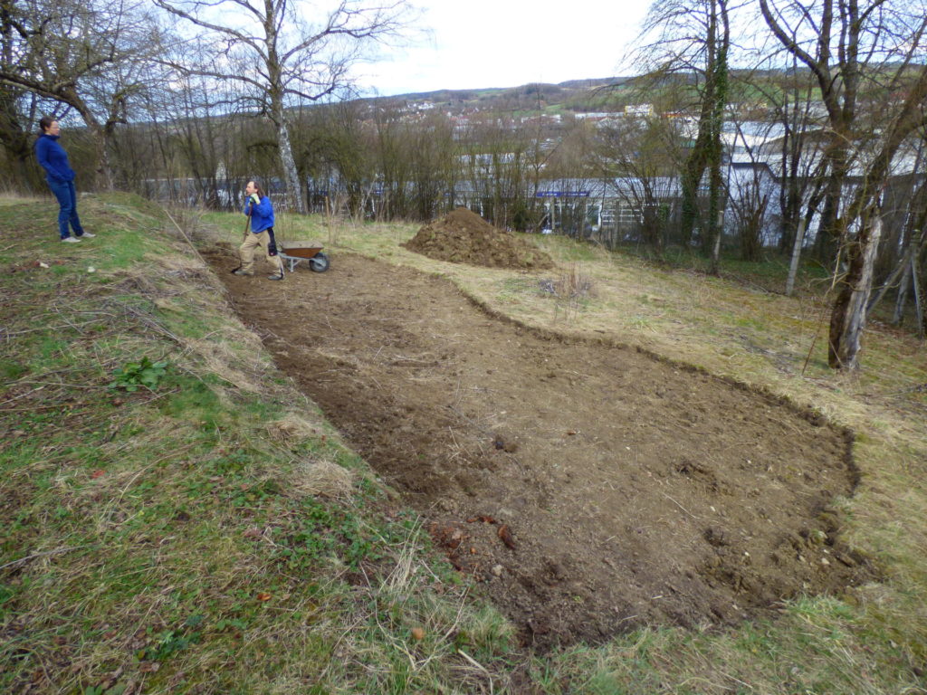 Insgesamt wurden ca. 60 cbm Material auf der Fläche von den 31 Gestalter*innen händisch(!), d.h. ohne Maschineneinsatz, bewegt. Am 13.03.2021 erfolgte der 1. Spatenstich um zuerst ca. 30 cm tief fetten Mutterboden abzutragen, anschließend wurden ca. 30 cm gebrochener Bauschutt eingebracht und als oberste Schicht nach Errichtung einer Trockenmauer mindestens 30 cm ungewaschener und lehmhaltiger Sand verfüllt. Im unmittelbaren Umfeld wurde Magerbodenweg angelegt, der hauptsächlich mit Sedumpflanzen geimpft wurde und flächig zuwachsen soll. Aus dem Aushub entstand eine sanft modellierte Hügellandschaft, die intensiv mit Stauden und Wiesensaat bepflanzt wurde. Im nahen Umfeld wurde die bienenfreundliche Durchwachsene Sylphie als Beispiel für eine Energiepflanze mit ökologischen Vorteilen belassen. Am 23.07.2021 fand das Projekt nach vorherigem punktuellem Pflanzimpfen mit dem weiteren Aussäen einer einheimischen Blühmischung am großen Aushubhügel sein vorläufiges gestalterisches Zwischenergebnis für den Pflanzwettbewerb. Es geht also noch weiter . . .