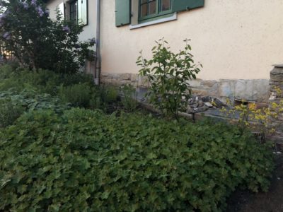 Im Vorgarten wurde ein solitärer Kirschlorbeer durch eine (nicht heimische) kleinbleibende Felsenbirne ersetzt. Rundherum war dann noch Platz für Wilde Möhre und Schwarze Königskerzen.