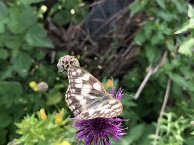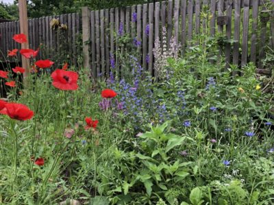 Bienen- und Falterbeet: Muskatellersalbei, Skabiosenflockenblume, Taubenkopfskabiose, Akelei, Karthäusernelke, Natternkopf, Nelkenleimkraut, Nachtkerze, Wilde Möhre, Eselsdistel, Klatschmohn, Kornblume,