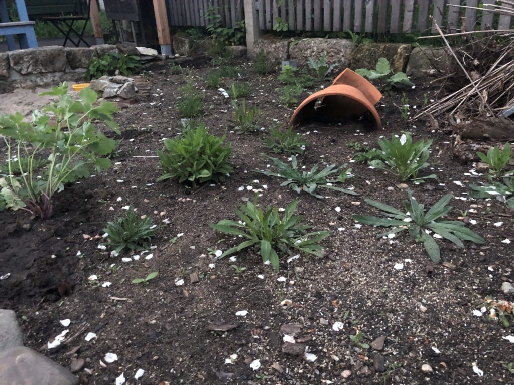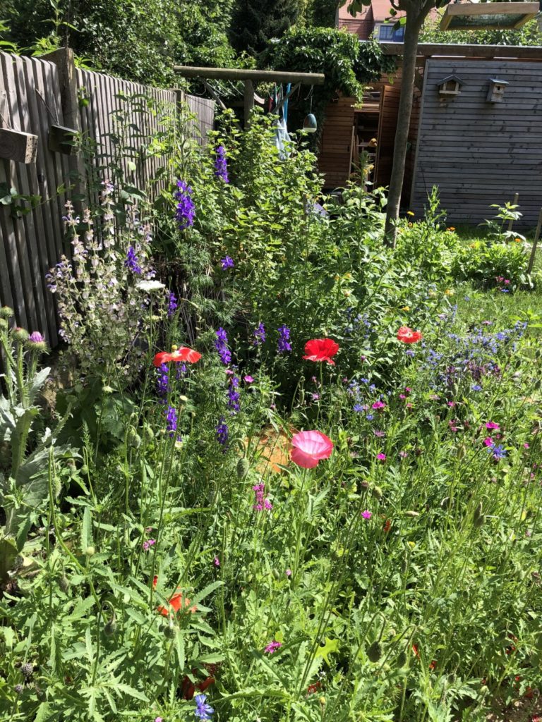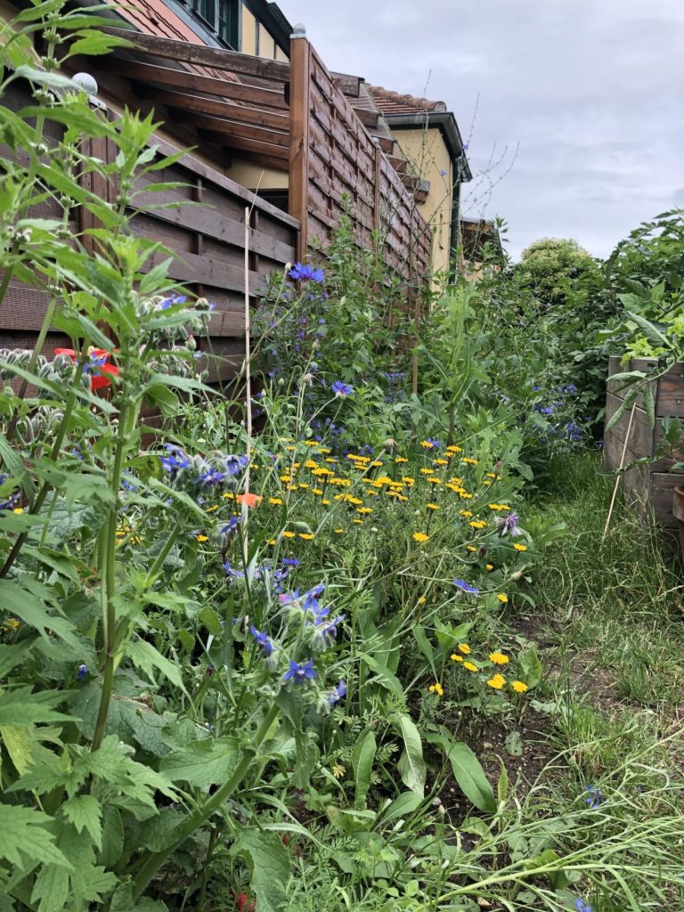 Außerdem durften in diesem Frühjahr an anderer Stelle endlich auch Lungenkraut, Frühlingsplatterbsen, Breitblättrige Platterbsen, Nesselblättrige Glockenblume, Gundermann, Gemeiner Hornklee, ein Behaarter Ginster, Bronzefenchel und ein Spalier-Birnbaum einziehen. Kriechender Günsel, Knoblauchsrauke, Nachtkerzen, Ochsenzunge, Ferkelkraut, Taubenkropfleimkraut, purpurrote und weiße Taubnesseln haben sich von allein eingefunden und dürfen natürlich bleiben!