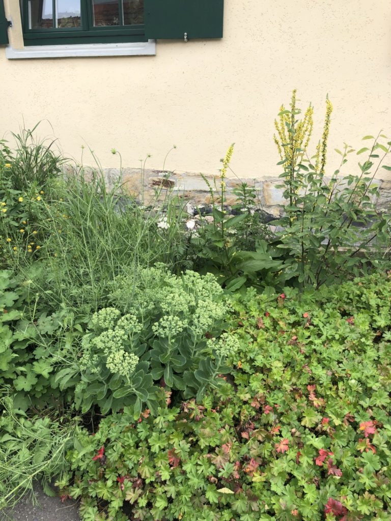 Im Vorgarten wurde ein solitärer Kirschlorbeer durch eine (nicht heimische) kleinbleibende Felsenbirne ersetzt. Rundherum war dann noch Platz für Wilde Möhre und Schwarze Königskerzen.