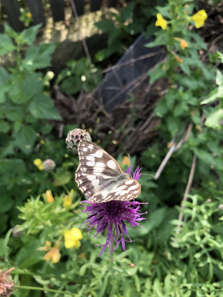Bienen- und Falterbeet: Muskatellersalbei, Skabiosenflockenblume, Taubenkopfskabiose, Akelei, Karthäusernelke, Natternkopf, Nelkenleimkraut, Nachtkerze, Wilde Möhre, Eselsdistel, Klatschmohn, Kornblume,