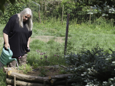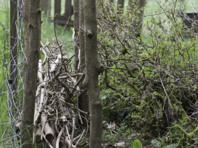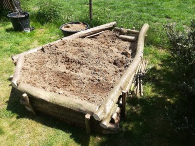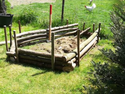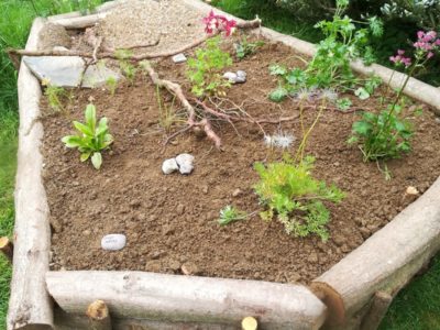 Eine kleine Totholzhecke und ein Hochbeet. Auch die Blumen- und Naturecke sollte etwas größer werden.