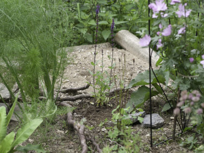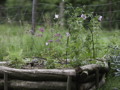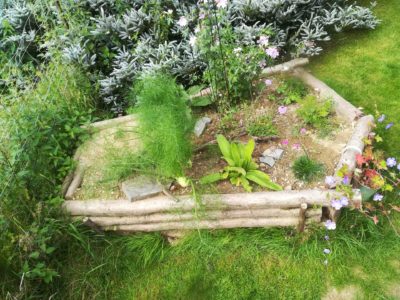 Das Hochbeet haben wir 3-Zonen-Beet getauft. Vom Herbst abgeschnittene Äste/Holz wurden für die Umrandung besorgt, aufeinander geschichtet und mit 65% Erde, 25% Sand-Lehm und 10% Lehm aufgefüllt. Im Teil mit der Erde sind Insektenfreundliche Pflanzen eingepflanzt worden. Sterndolde, Malve, Akelei, Kugel-Primel, Kuhschelle, Fenchel, Sonnenhut und Grasnelke.