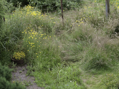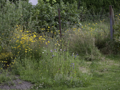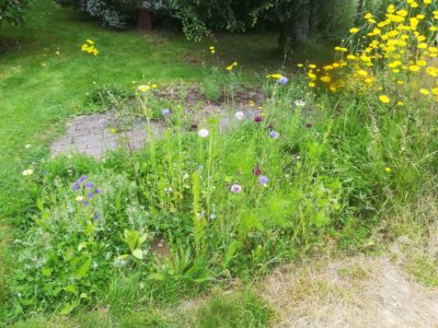 Blumenwiese: Färberkamille, Kreuzkraut, Habichtskraut, Wicke, Glockenblumen, Klee, Günsel, Wiesen-Schafgarbe, Disteln, Hornklee, Kornblume, Schmuckkörbchen, Malve, Labkraut, …..