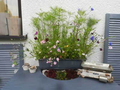 Im Hochbeet: Sterndolde, Malve, Akelei, Kugel-Primel, Kuhschelle (Küchenschelle), Fenchel, Sonnenhut, Salbei, Scabiosa und Grasnelke. Im Topf: Geranium