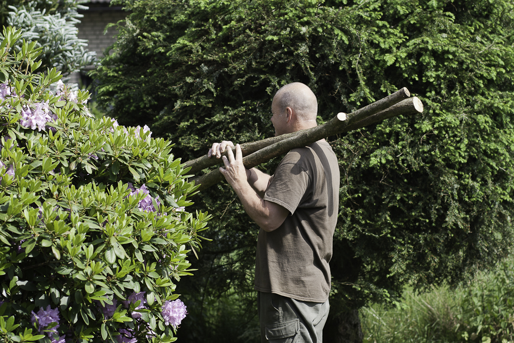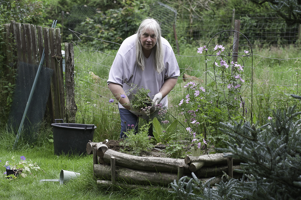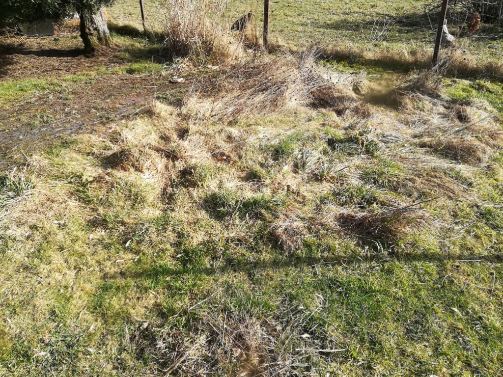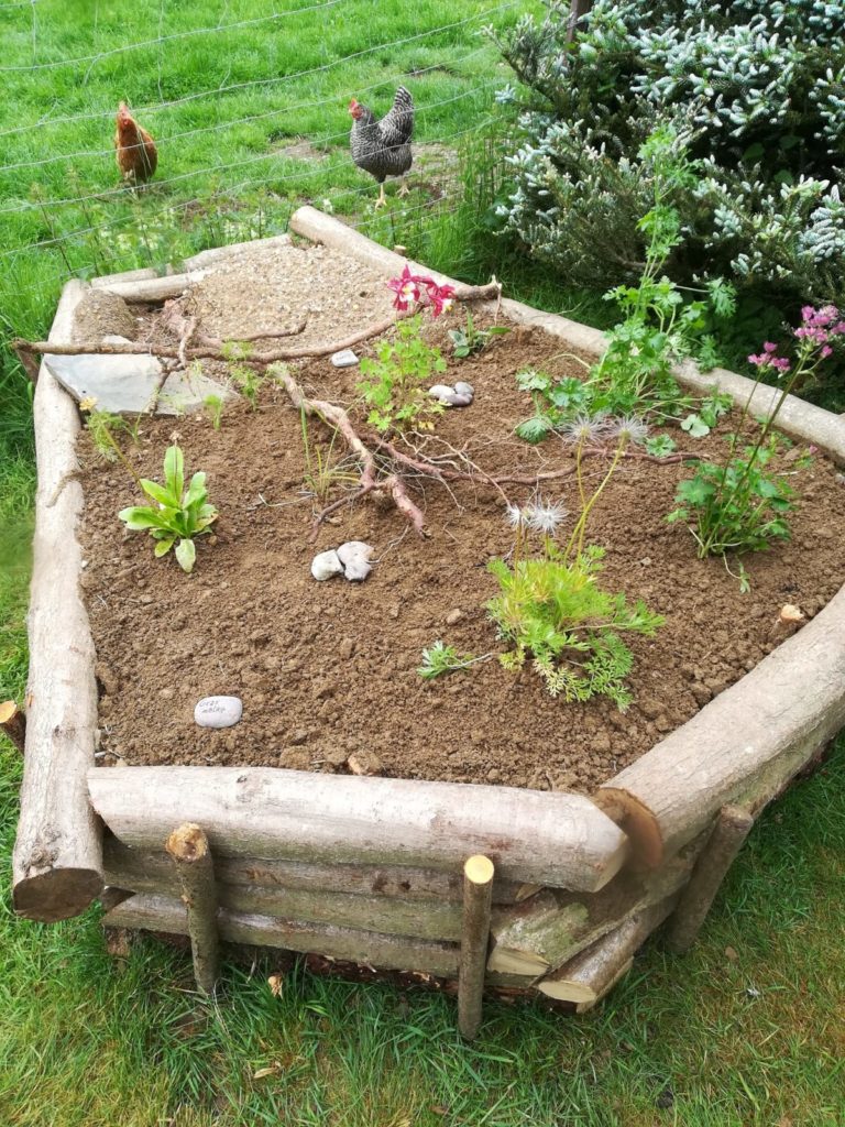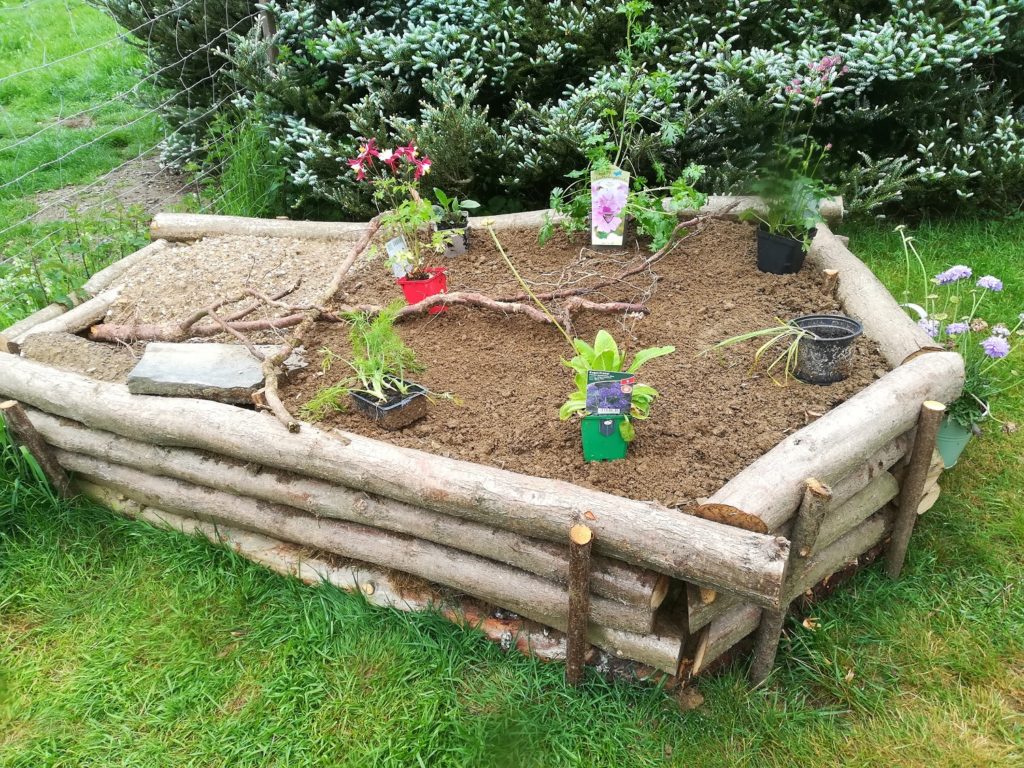 Eine kleine Totholzhecke und ein Hochbeet. Auch die Blumen- und Naturecke sollte etwas größer werden.