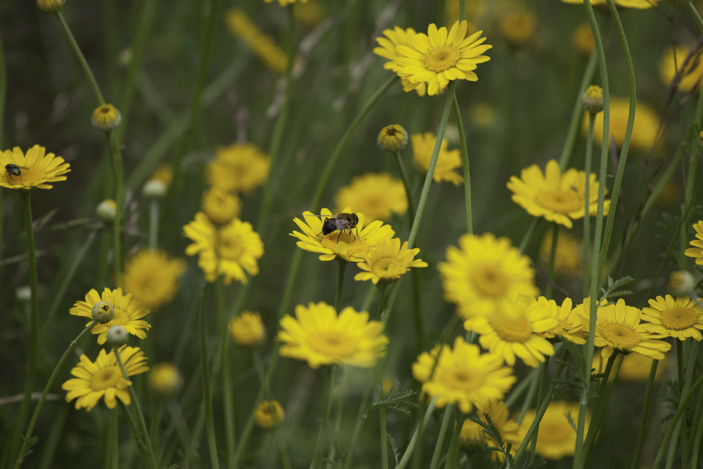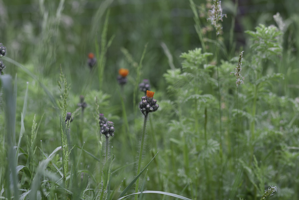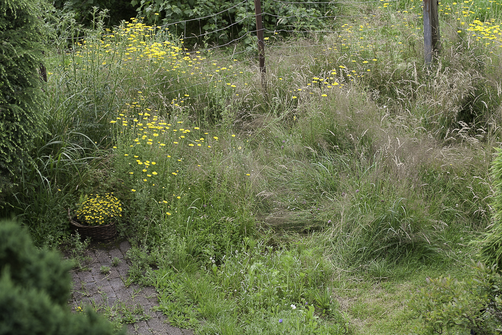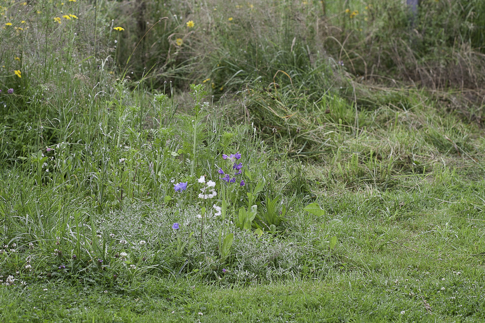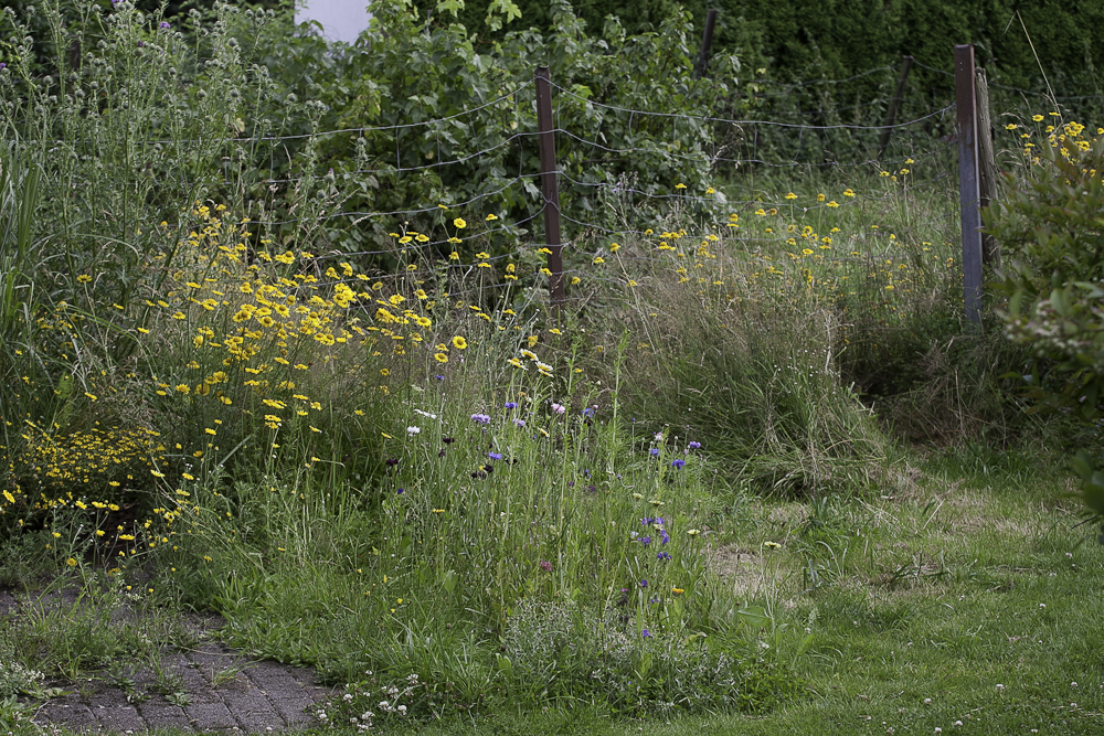 Blumenwiese: Färberkamille, Kreuzkraut, Habichtskraut, Wicke, Glockenblumen, Klee, Günsel, Wiesen-Schafgarbe, Disteln, Hornklee, Kornblume, Schmuckkörbchen, Malve, Labkraut, …..