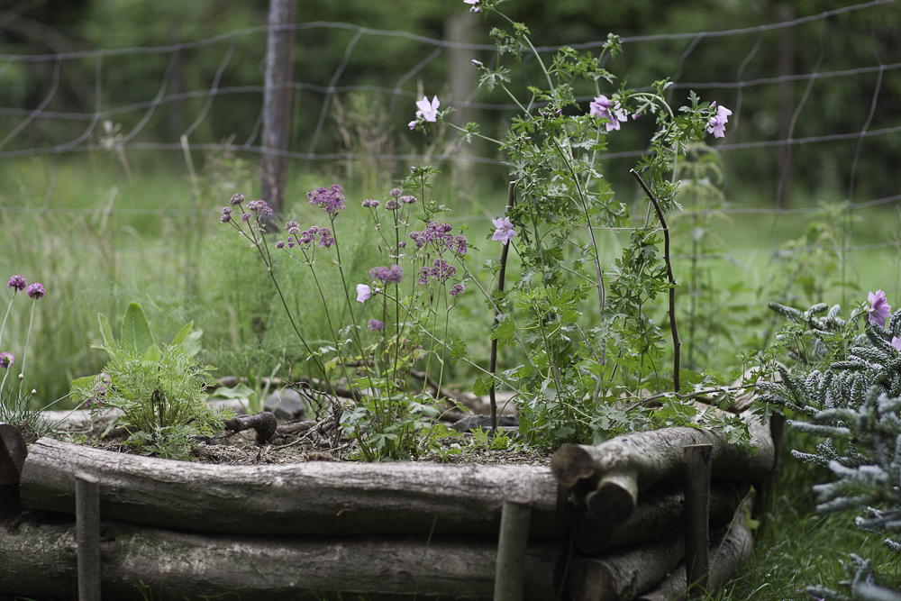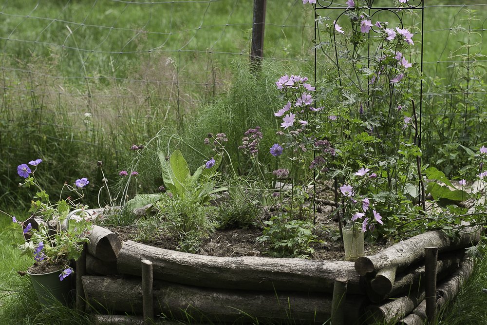 Im Hochbeet: Sterndolde, Malve, Akelei, Kugel-Primel, Kuhschelle (Küchenschelle), Fenchel, Sonnenhut, Salbei, Scabiosa und Grasnelke. Im Topf: Geranium