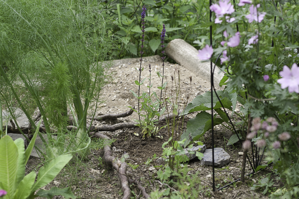 Das Hochbeet haben wir 3-Zonen-Beet getauft. Vom Herbst abgeschnittene Äste/Holz wurden für die Umrandung besorgt, aufeinander geschichtet und mit 65% Erde, 25% Sand-Lehm und 10% Lehm aufgefüllt. Im Teil mit der Erde sind Insektenfreundliche Pflanzen eingepflanzt worden. Sterndolde, Malve, Akelei, Kugel-Primel, Kuhschelle, Fenchel, Sonnenhut und Grasnelke.