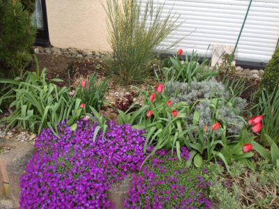Steinpflanzen, Tulpen, Sterne, Pfingstrosen, Staudenblume, Bux, Rosen, Vergissmeinnicht , Mohn, Farn, Enzian, Gingster, pampasgras,