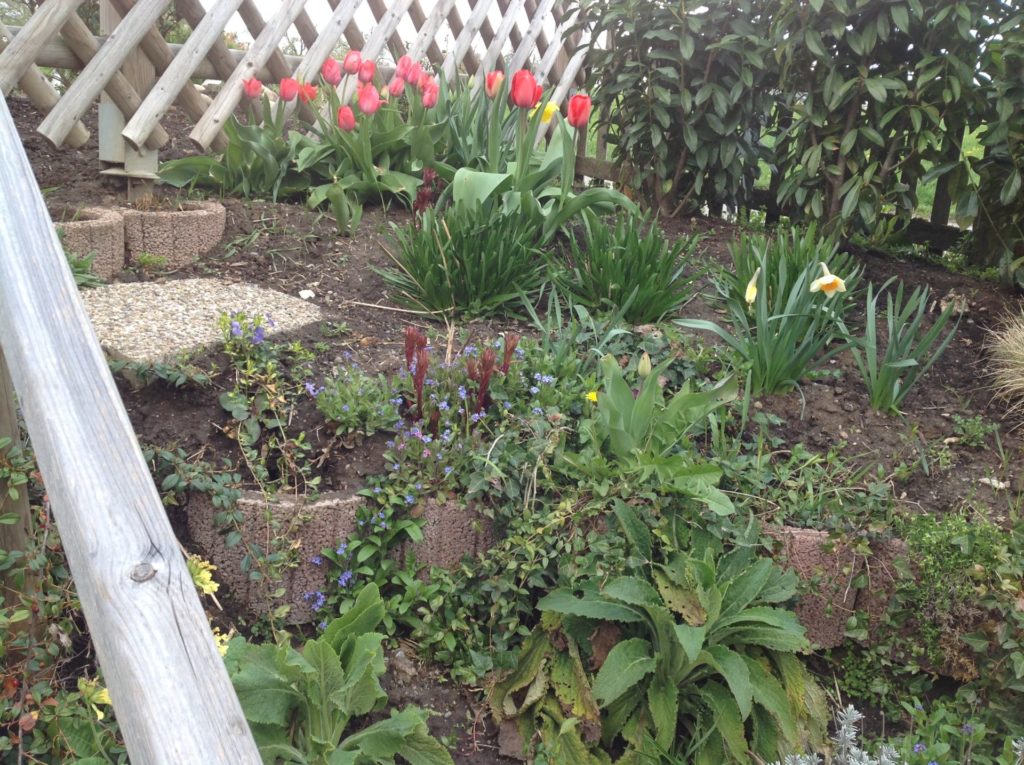 Hügel am Garten und Pflanzenbeet vor dem Haus