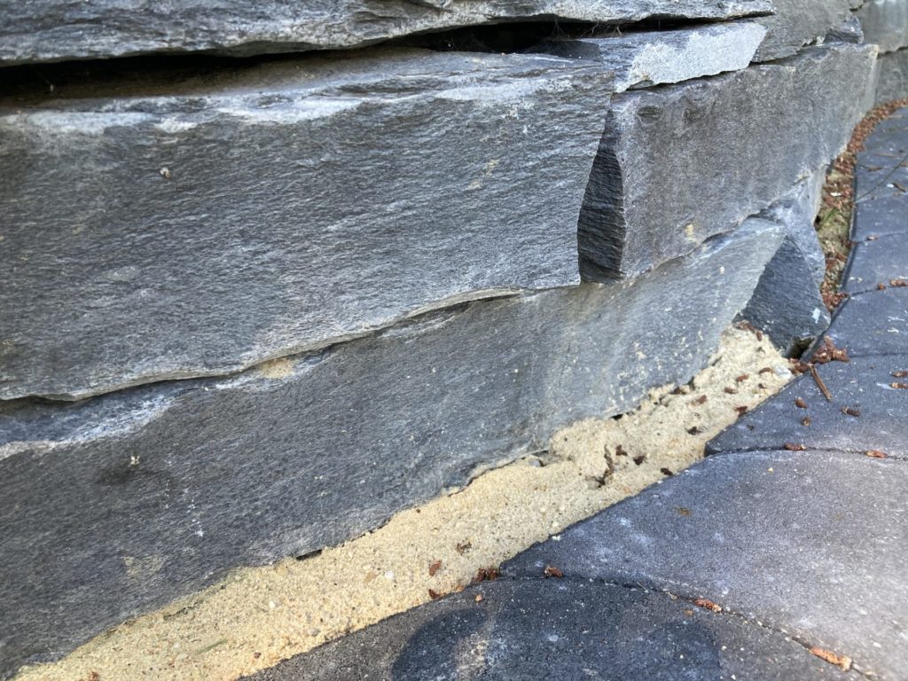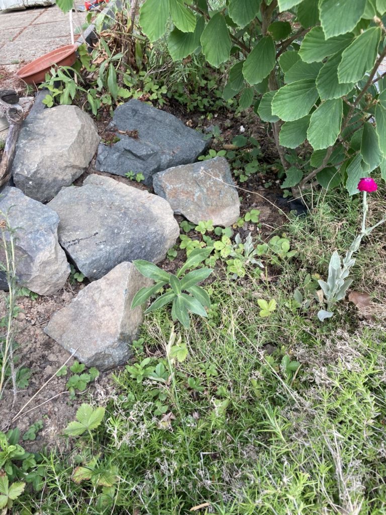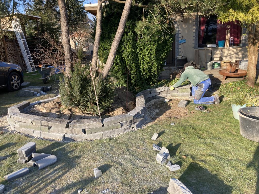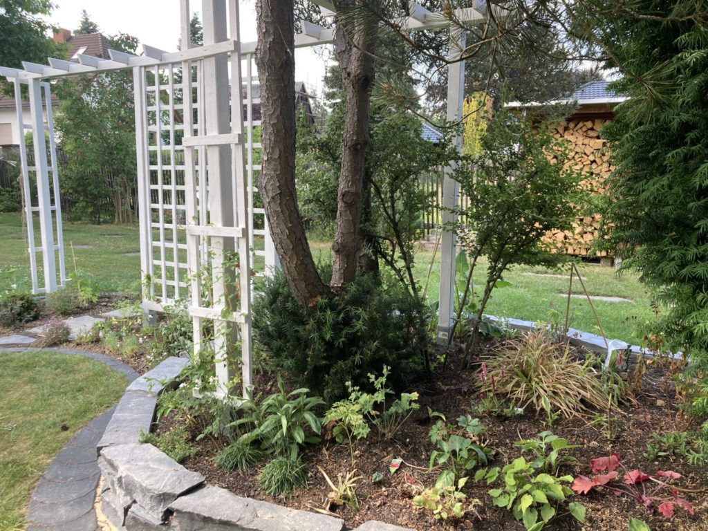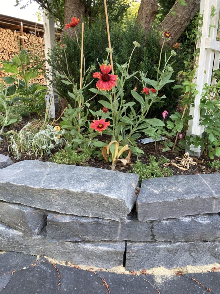 Im März haben wir begonnen, die Natursteinmauer aus heimischem Naturstein zu setzen. Dort wachsen nun Schattenstauden unter dem vorhandenen Baumbestand von Kiefer und Eibe, die belassen wurden, da sie häufig zum Brüten genutzt werden.