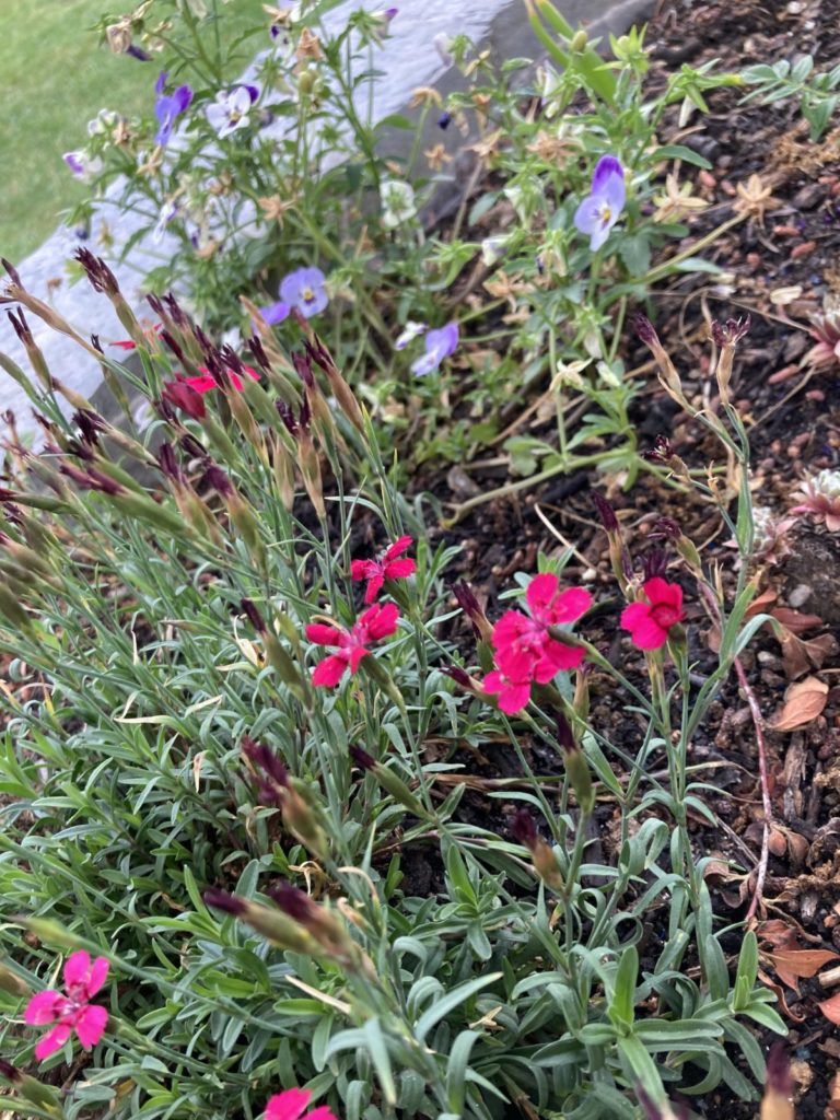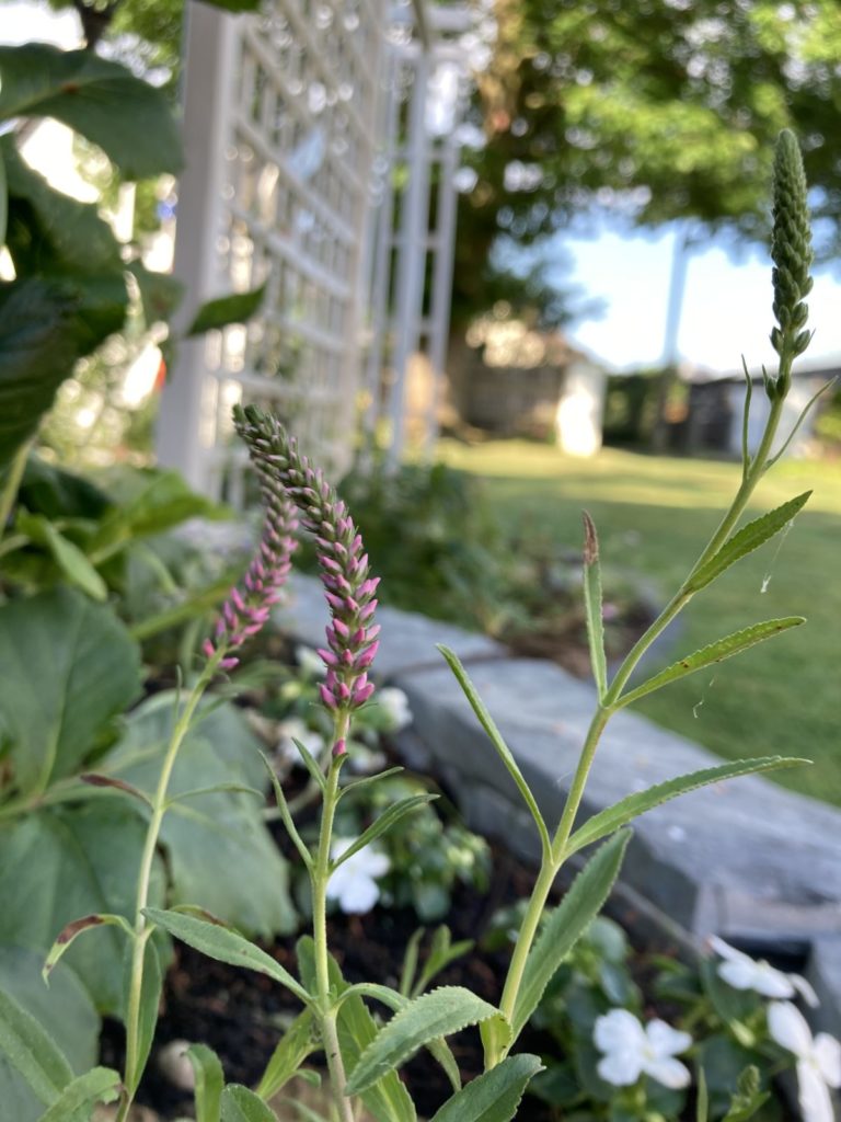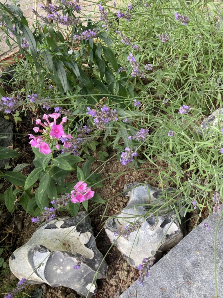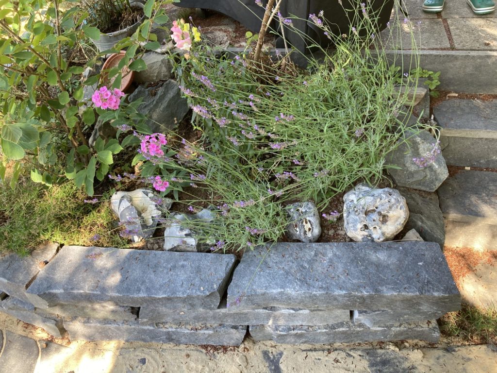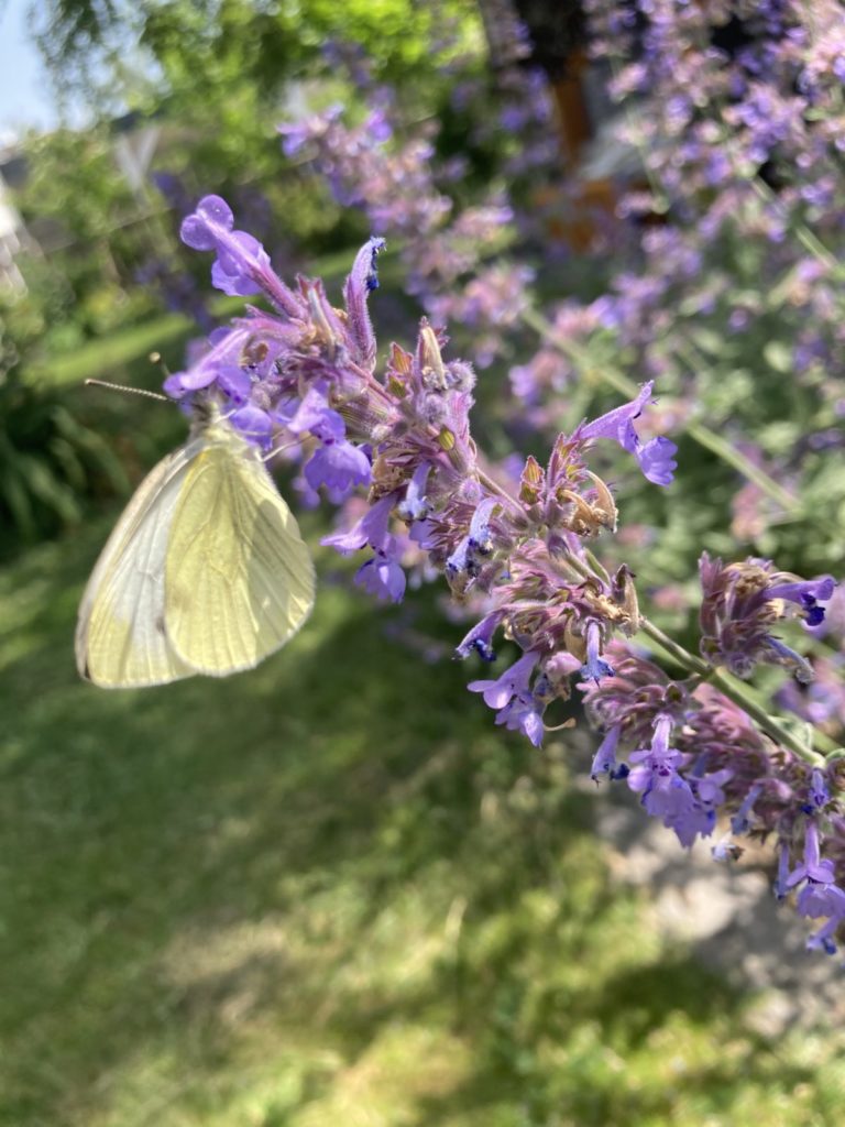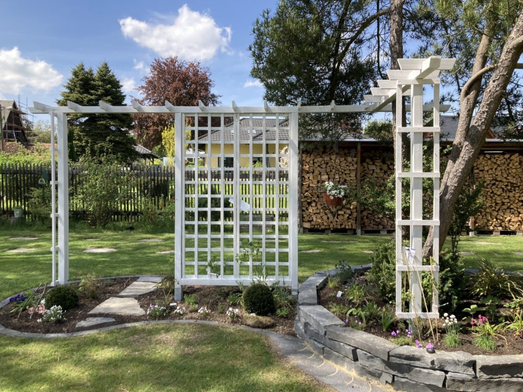 Schließlich wurde der sonnige Bereich um die Pergola im Mai noch mit Blühstauden bepflanzt, die reichlich Nahrung für Bienen und Schmetterlinge bieten. Die Natursteinmauer bietet außerdem ein Sandarium für Sandbienen.