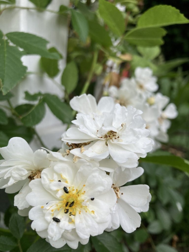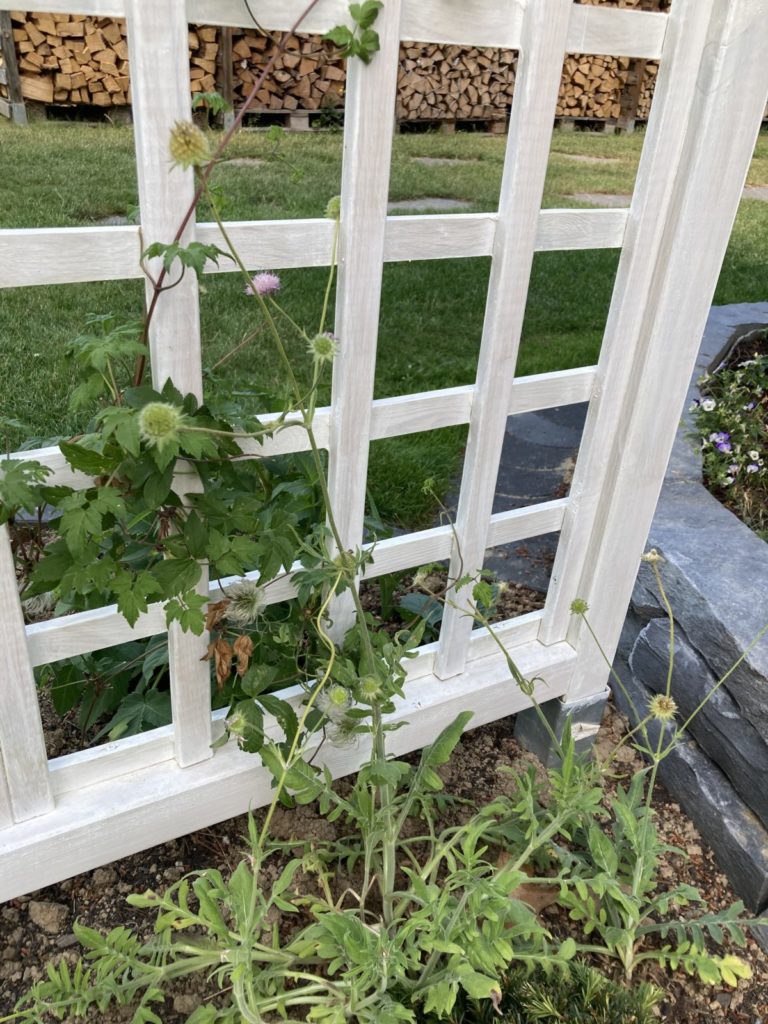 Einige Wochen später begann der Bau der Pergola, die nun mit Rosen, Clematis und Wicken bepflanzt wurde. Ungefüllte Kletterrosen sollen hier bald das Holz beranken und die Wildbienen anlocken. Deshalb haben wir für das Holzlager hinter dem neuen Bereich auch ein neues Wildbienenhotel gebaut und im Mai angebracht.