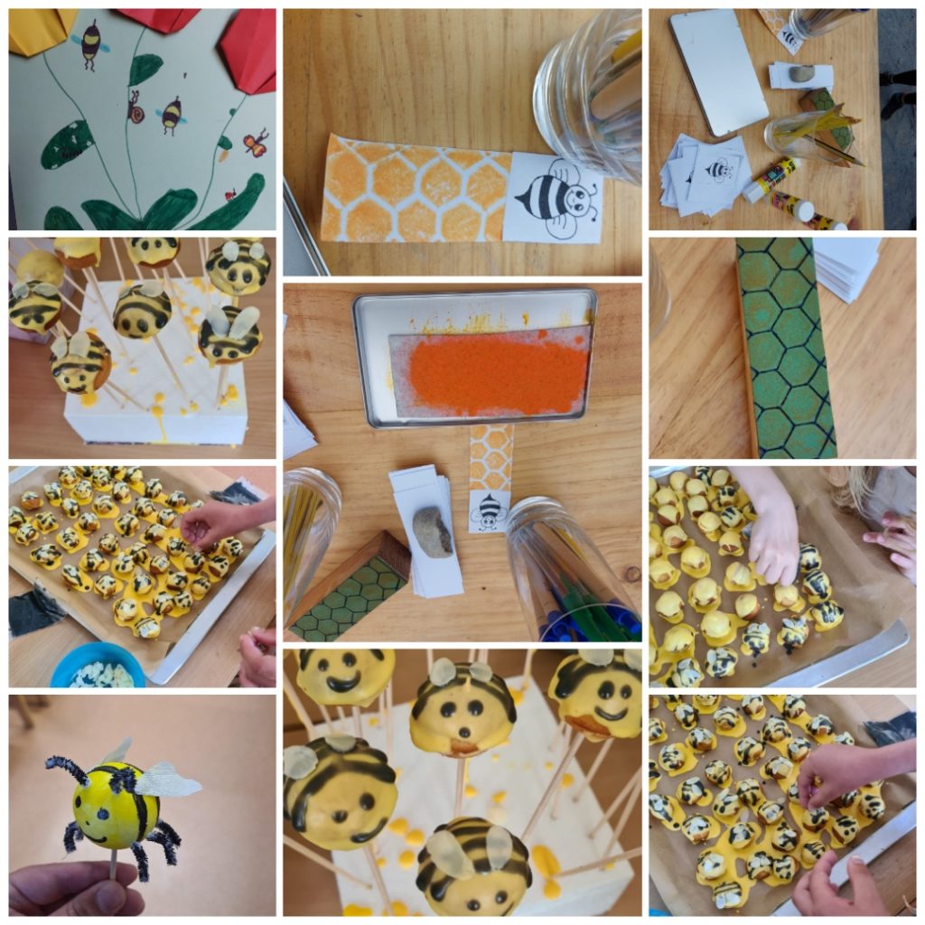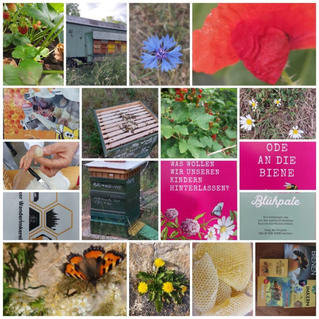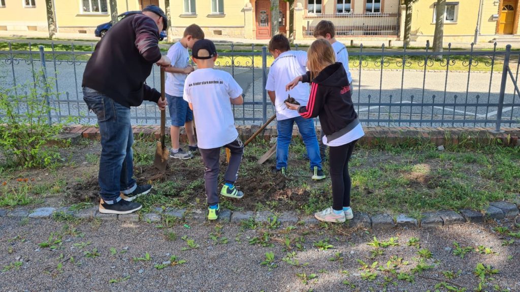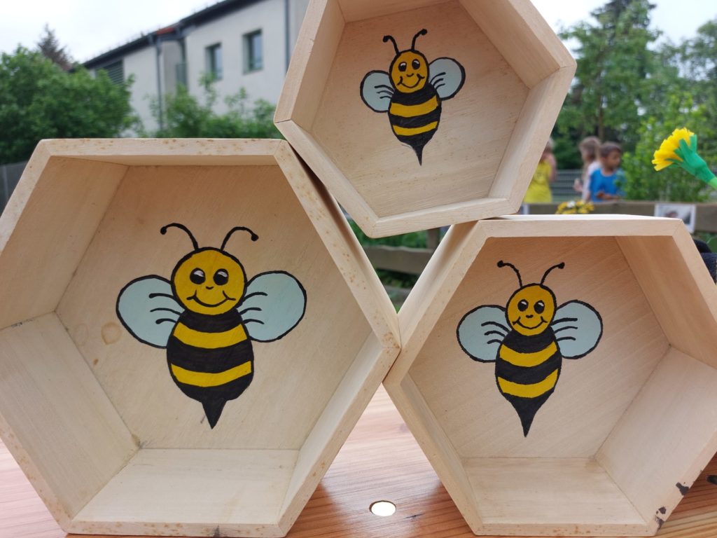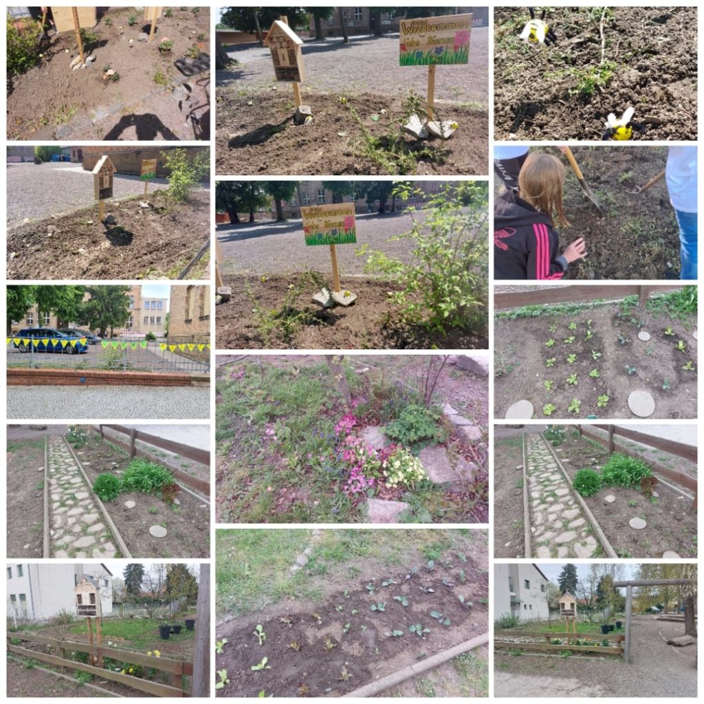 Wir haben uns als Hort mit dem Heimat bewegen e.V. sowie Frau Nancy Ziegenhorn (Start Up Ode an die Biene vernetzt. Weiterhin haben wir eine Imker-Patin aufgetan, die uns dabei unterstützen wird, eine eigene Imkerei für Kinder zu gründen. Aktuell haben wir das Glück, eine Imker-Ausrüstung samt Bienenvolk zu erhalten. Auf einer alten Streuobstwiese (Frau Artl) konnten wir bereits einen neuen Baum pflanzen (alte Obstsorte) und wollen dies gern weiter ausbauen. Wir haben verschiedenste Aktionen zum Thema Bienen durchgeführt. Im Hortgarten haben wir bienenfreundliche Pflanzen gepflanzt und zum Eingang des Schulgeländes eine Insektenwiese angelegt. Weiterhin haben wir ein Insektenhotel am Eingang zum Schulgelände aufgestellt, ein weiteres im Hortgarten. Zum Tag der Biene am 20.05.22 gab es ein buntes Programm rund um das Thema Bienen. Es konnten mit selbst angefertigten Stempeln Lesezeichen mit Bildern von Bienen und Waben hergestellt werden. Es gab ein Bienen-Quiz mit anschließender Verlosung (Insekten-Hotel, Bücher zum Thema Bienen, Honig, kleines Gewächshaus, Samenmischungen). Es gab eine Honigverkostung. Weiterhin konnten kleine Bienen gebastelt werden (Styropor und Pfeifenreiniger). Zu naschen gab es kleine Cake-Pops in Form von Bienen. Mit dem Heimat bewegen Verein hatten wir bereits im Vorfeld auf dem Vereinsgelände eine Blühwiese angelegt. Darüber hinaus konnten die Kinder kleine Nisthilfen für Bienen bauen. Unsere Musik-AG sowie die 2.Klasse haben ein eigenes Bienen-Lied komponiert und vorgetragen.