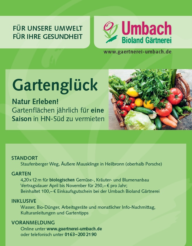 Immer mehr Menschen legen Wert auf gesunde Ernährung möglichst ökologischen Ursprungs, bestenfalls aus Eigenanbau. Hierbei möchten wir unterstützen und die Möglichkeit geben eigenes Bio-Gemüse anzubauen und sich somit gesund zu ernähren. Ebenso ist es uns ein großes Anliegen speziell Kinder wieder mehr in die Natur zu holen. Hier können Sie sehen wie aus Pflanzen erntereifes Gemüse wächst. Auch erleben und erlernen die Kinder einen bewussten und nachhaltigen Umgang mit der Natur. Nicht zuletzt wollen wir damit den Umweltschutz unterstützen und stellen die bisher konventionell bewirtschafteten Flächen auf Bio-Anbau um. Unser Gemeinschaftsgärten Projekt „Gartenglück“ sieht die Vermietung von 130 Gartenflächen je 50m² zur saisonalen Bewirtschaftung nach Biolandkriterien und Mitgliedschaft bei "Natur im Garten"- Deutschland vor. Über 50 Gärten sind bereits an Hobbygärtner*innen aus dem Stadt und Landkreis Heilbronn vermietet. Die Gartenpacht beinhaltet einen großzügigen Einkaufsgutschein in unserer Bioland zertifizierten Gärtnerei um sicher zu stellen, dass die Pflanzen und Setzlinge auch den Bio-Normen entsprechen. Zudem gibt es vor Ort Zugang zu kostenloser Wasserversorgung, Bereitstellung von biologischem Dünger und Kompost und Garten- bzw. Arbeitsgeräten sowie monatliche Informations-Veranstaltungen, Kulturanleitungen und Gartentipps.