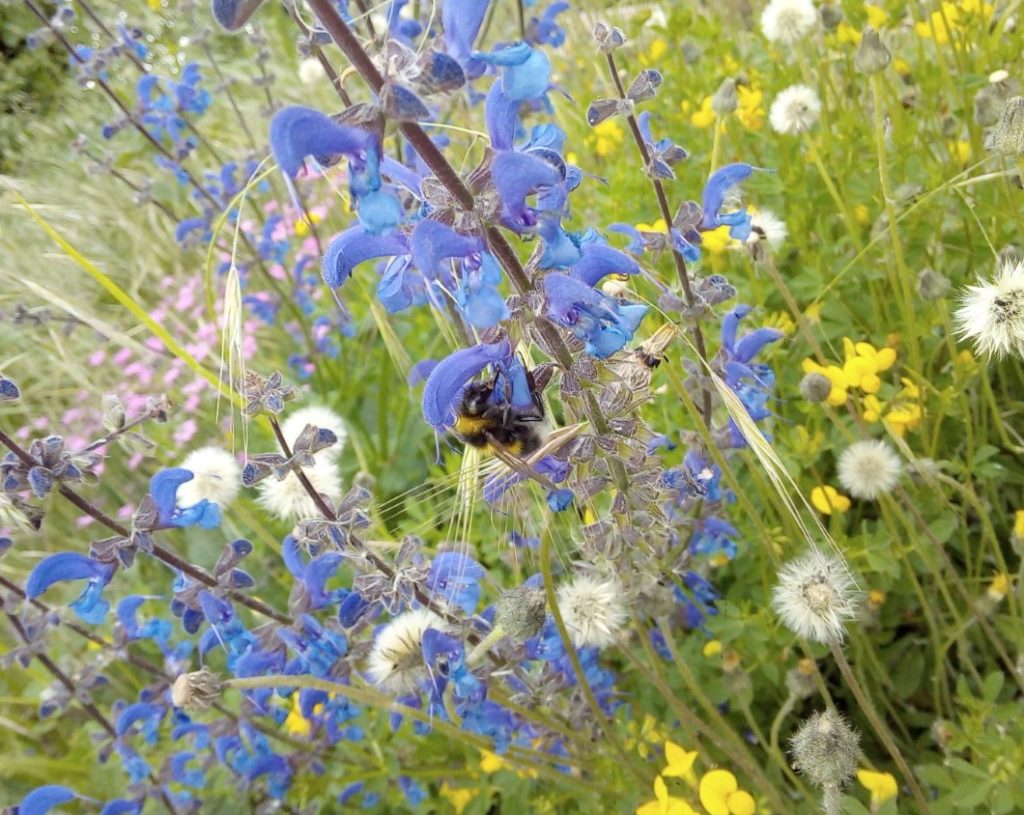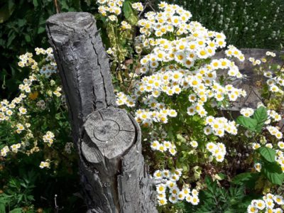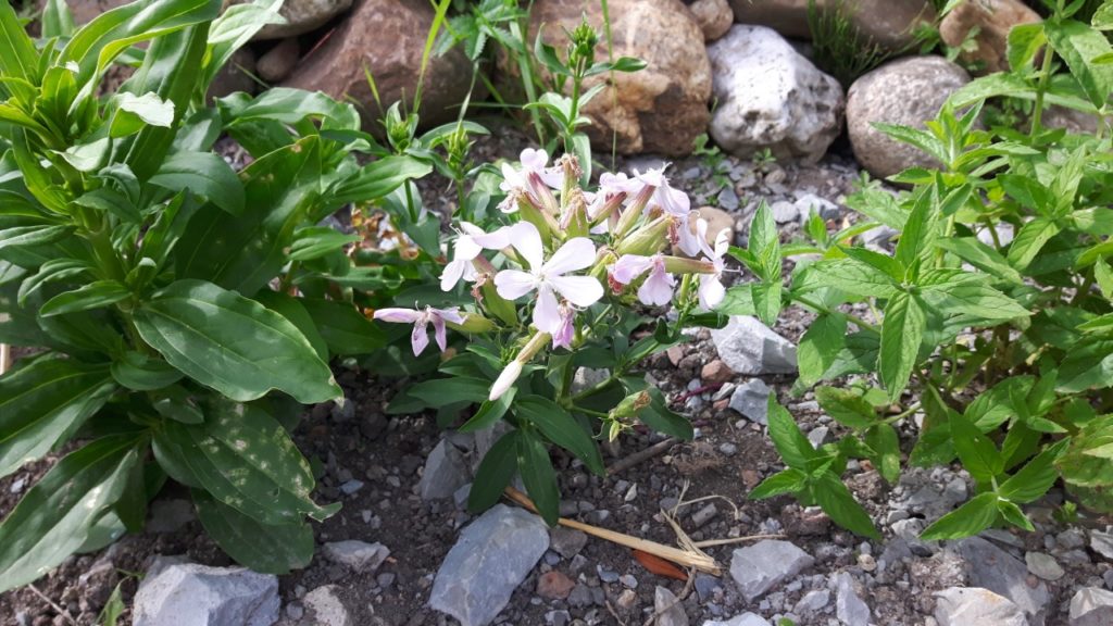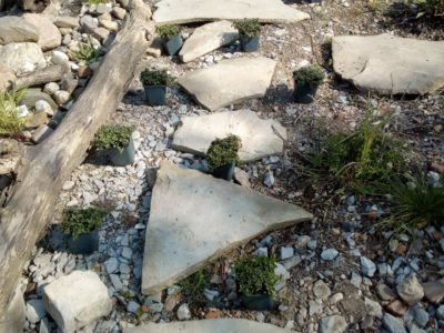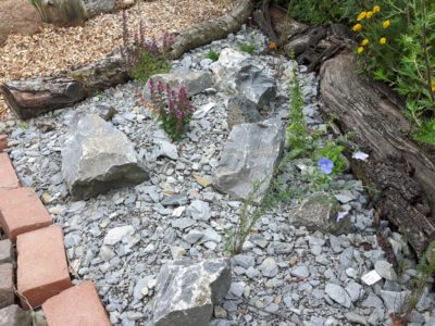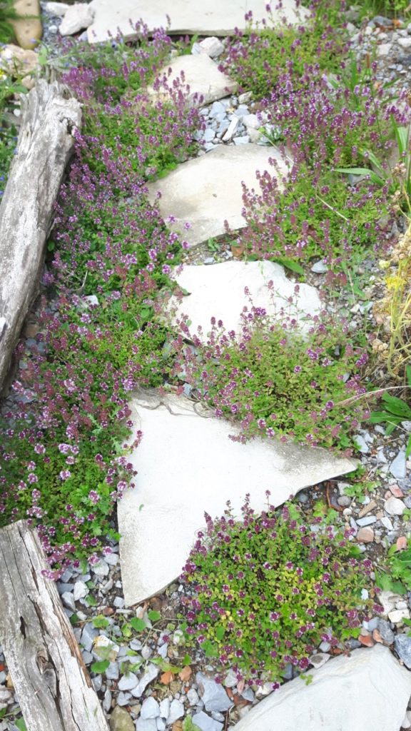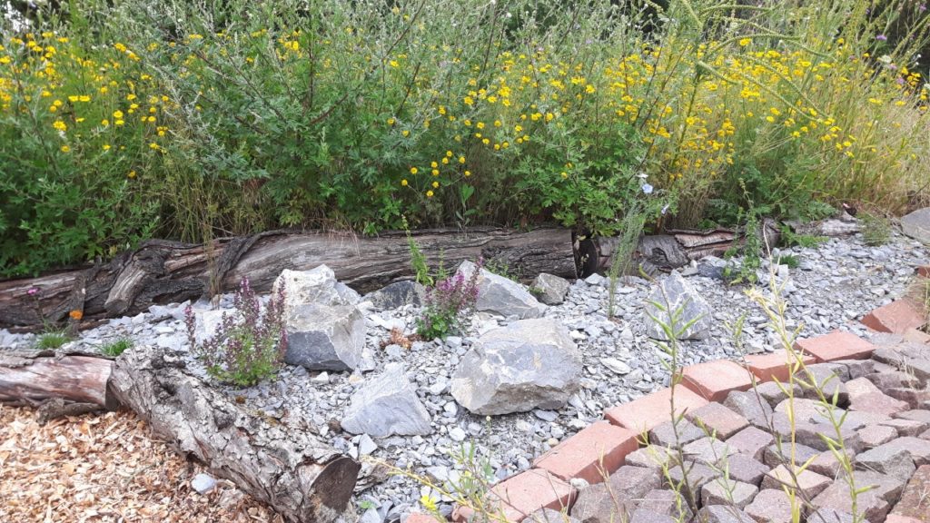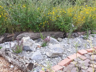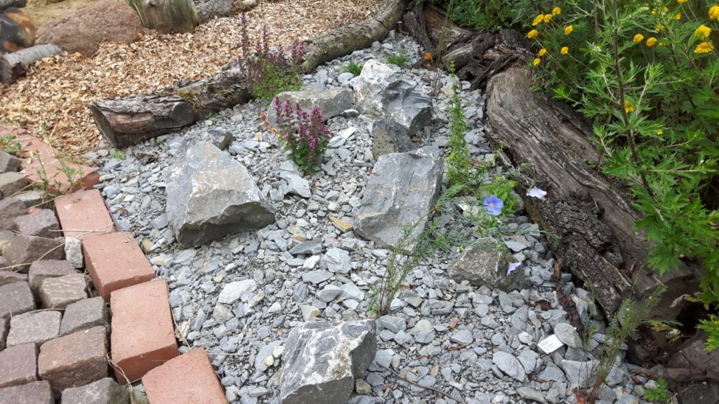 Stauden: Schleifenblume, Thymian, Steinbrech, Erdbeeren, verschiedene Polsterglockenblumen, Waldmeister, Zimbelkraut, Steinsame, Lavendel, Echtes Seifenkraut, Ross Minze, Gewöhnliche Schafgarbe, Karthäuser-Nelke, Sumpf-Wolfsmilch, Echtes Labkraut, Wiesen-Alant, Sibirische Schwertlilie, Magerwiesen-Margerite, Ausdauernder Lein, Gewöhnlicher Hornklee, Blut-Weiderich, Sumpf-Vergissmeinnicht, Wilder Majoran, Spitz-Wegerich, Wiesen-Salbei, Aufrechter Ziest, Edel-Gamander, Gamander-Ehrenpreis, Polei-Minze, Schmalblättriges Wollgras, Sumpf-Haarstrang