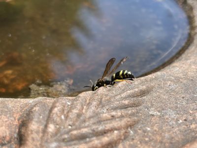 Sie lieben unsere Hausfassade aus Basaltstein mit den vielen Poren, in denen sie ihre Eier ablegen, aber auch der Kaminholzstapel, den wir nicht mehr anfassen, da unser Igel darin wohnt, ist begehrt. Selbstverständlich stehen immer zwei flache Wasserschalen gefüllt bereit, eine am Boden und eine auf dem Gartentisch.