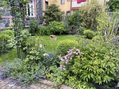 Stauden: Storchenschnabel, Schafgarbe, Wollziest, Steppensalbei, Katzenminze, Glockenblumen, Vergißmeinicht, Akelei, Frauenmantel, Bergenie, Herbstanemone, Astern, Phlox, Verbene, Pfingstrose, Löwenmäulchen,….