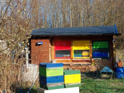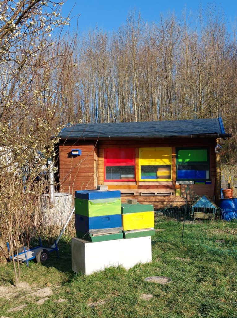 Um diese kleinen Wildbienen in meinen Garten zu locken, habe ich extra im Bereich meines Bienenhauses kleine Pflanzen eingegraben und eine Kletterhilfe befestigt. So können sich dort Zaunrübensandbienen und natürlich auch meine Bienen Pollen sammeln, oder kurz eine Pause in der Sonne machen. Damit die Zaunrübensandbienen auch die Möglichkeit haben, ihre Eier an geeigneter Stelle abzulegen, habe ich direkt zwischen der Zaunrübenpflanzen und des Bienenhauses ganz feinkrümmelige, sandige Erde verteilt. Diese bleibt durch den Dachüberstand des Hauses schön trocken.