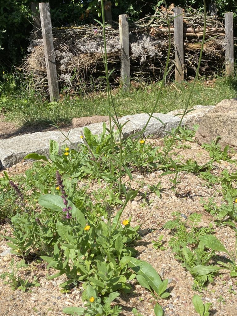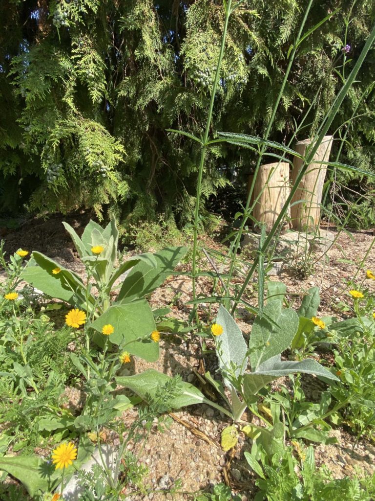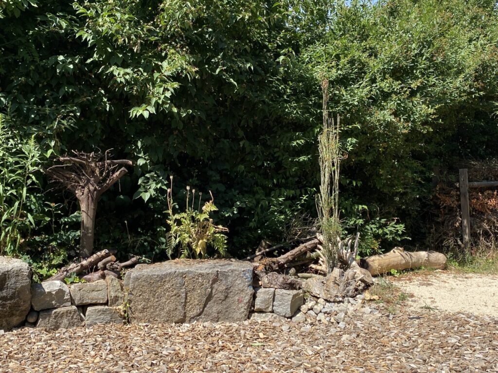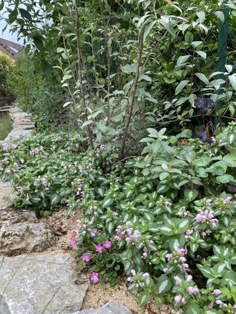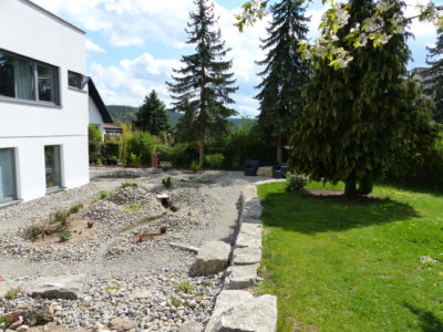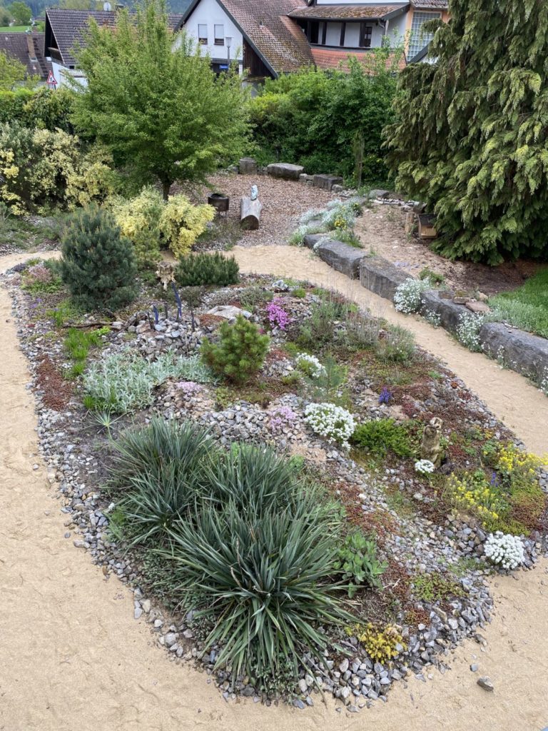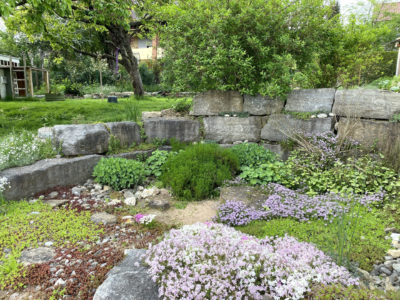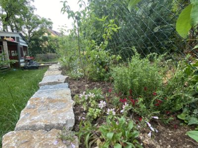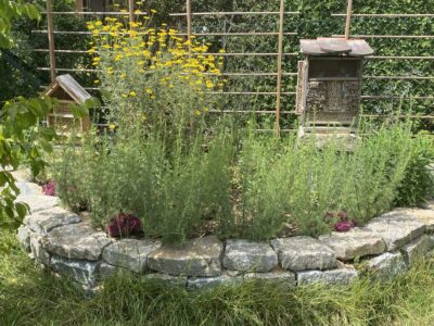 Jedes Jahr setzen wir neue Gartenprojekte um. Letztes Jahr entstand ein neues Beet mit vorwiegend stark duftenden Pflanzen (wie etwa Colawermuth, Fenchel und Duftnessel) eingerahmt von einer Trockenmauer und im Hintergrund Hechtrosen. In dieses Beet platzierten wir unsere Bienenhotels.