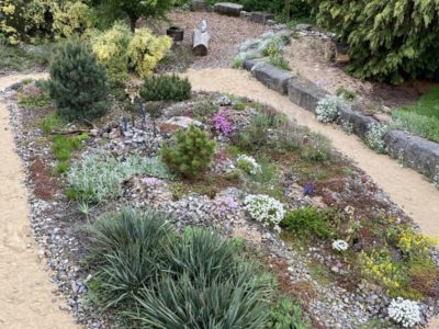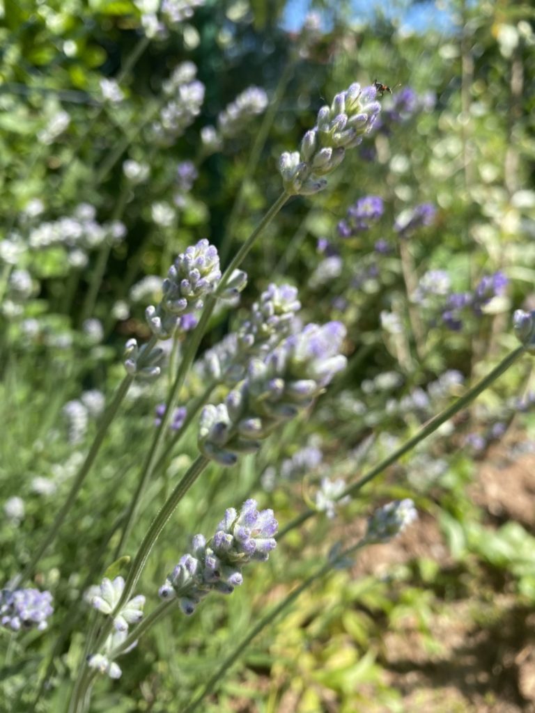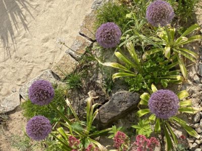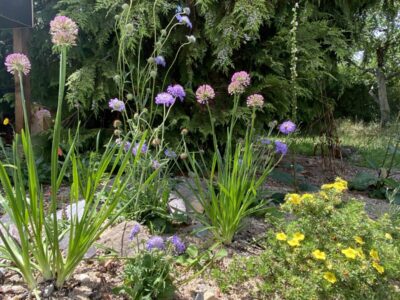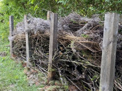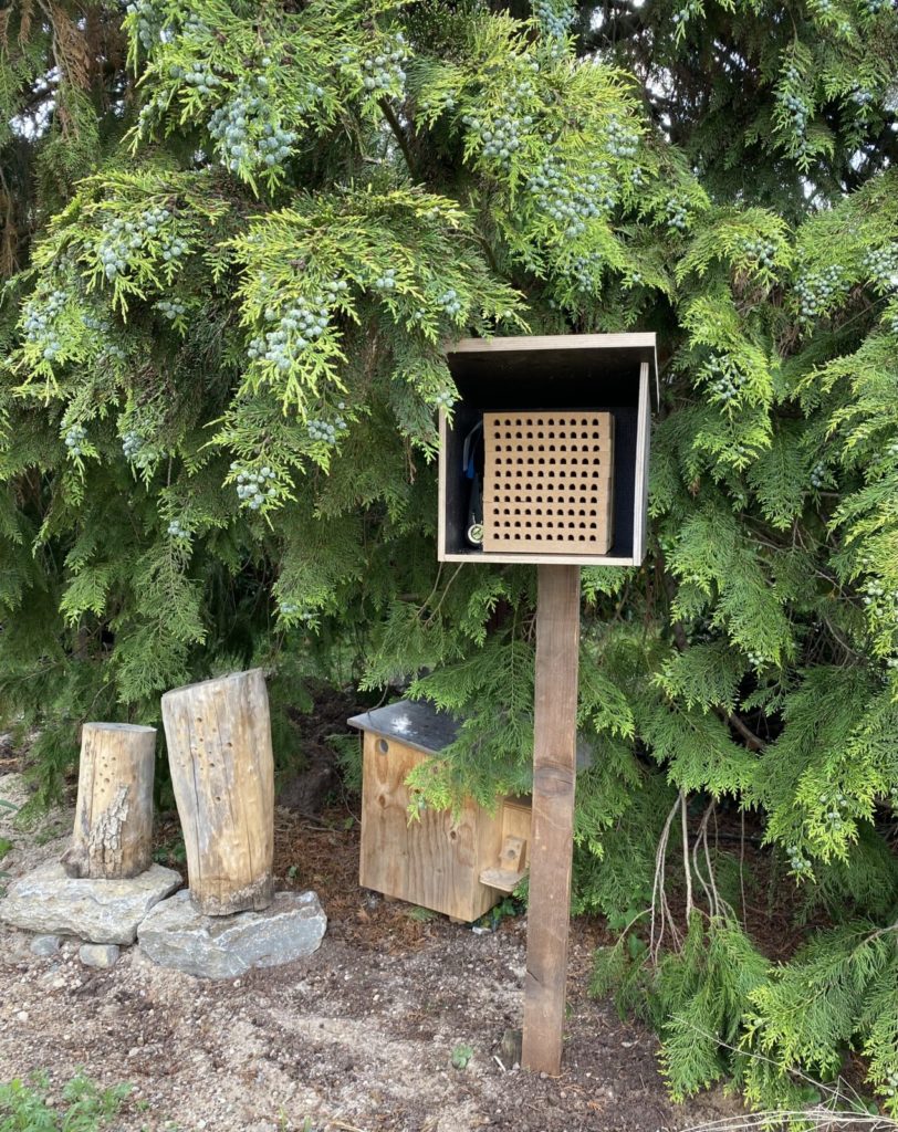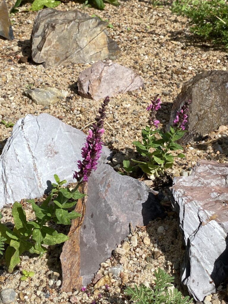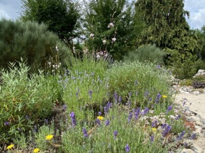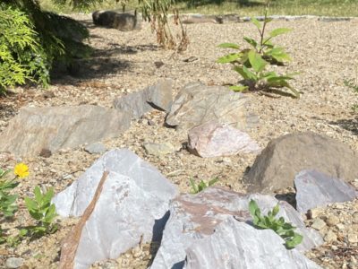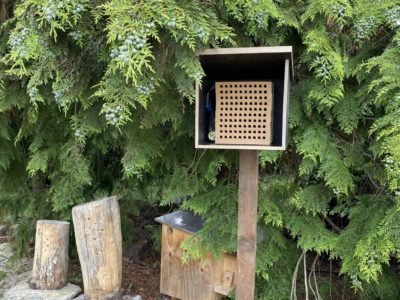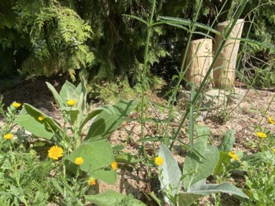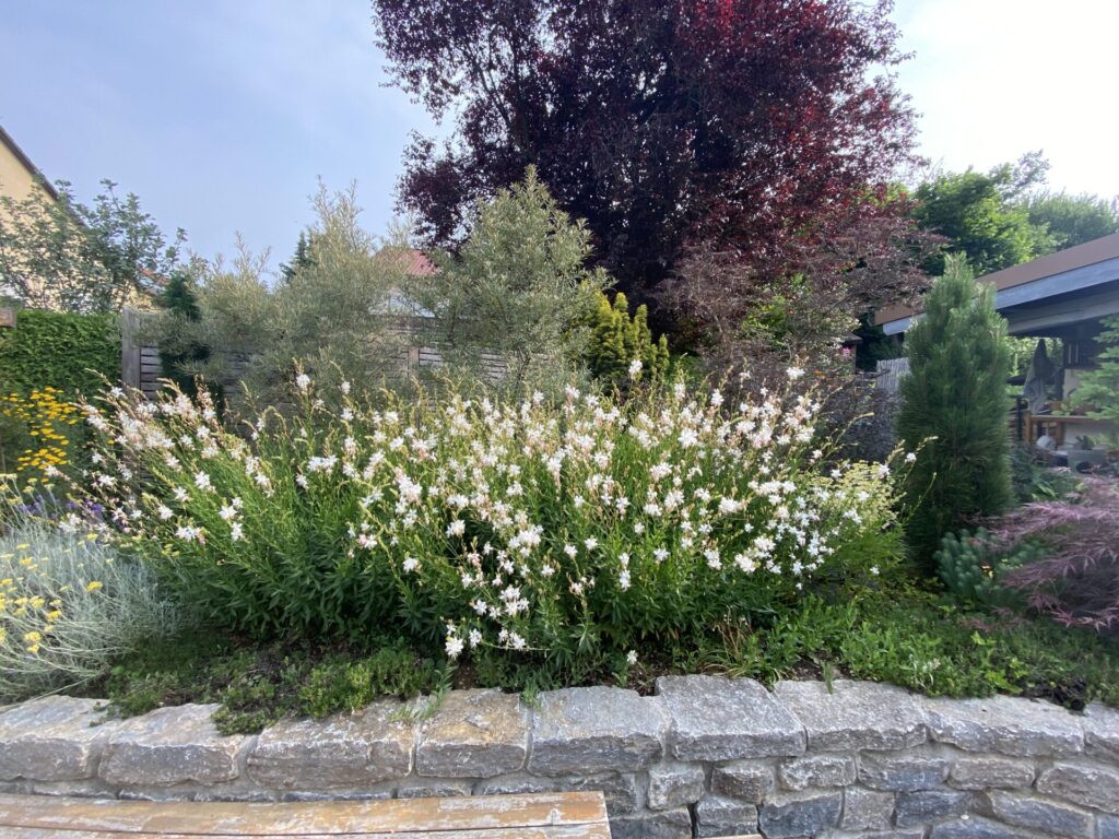 Jedes Jahr setzen wir neue Gartenprojekte um. Letztes Jahr entstand ein neues Beet mit vorwiegend stark duftenden Pflanzen (wie etwa Colawermuth, Fenchel und Duftnessel) eingerahmt von einer Trockenmauer und im Hintergrund Hechtrosen. In dieses Beet platzierten wir unsere Bienenhotels.