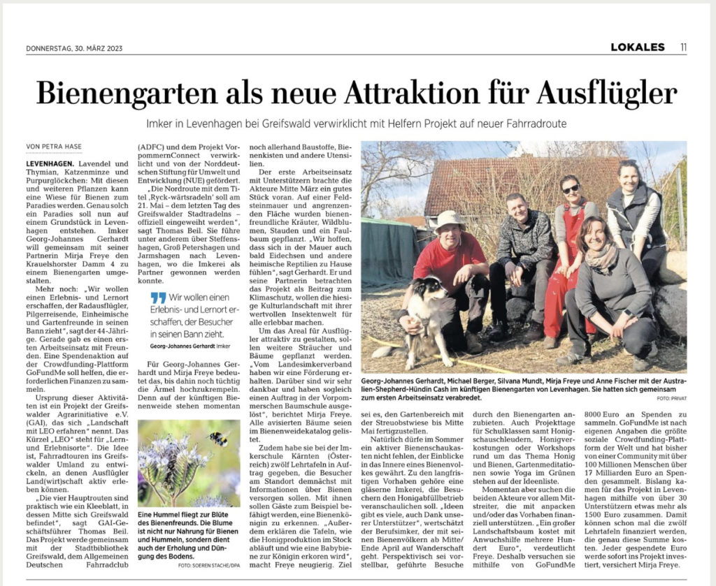 wir sind Miri & George und gestalten gerade voller Eifer und Vorfreude einen Bienengarten auf einem privaten Grundstück in Levenhagen bei Greifswald an der Ostsee. Aus unserer Idee dort langfristig einen schönen Lern- und Erlebnisort für alle zu erschaffen wurde innerhalb von nur wenigen Wochen Realität.