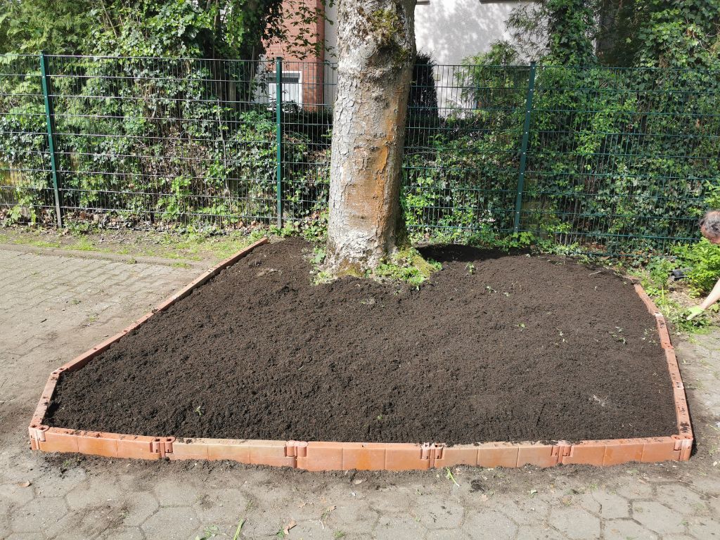 Die Naturforschergruppe hat in den vergangenen Tagen eine Fläche im Eingangsbereich vorbereitet und mit einer Umrandung versehen. Hier soll eine bienenfreundliche Fläche entstehen, die zum Staunen und Verweilen einlädt.