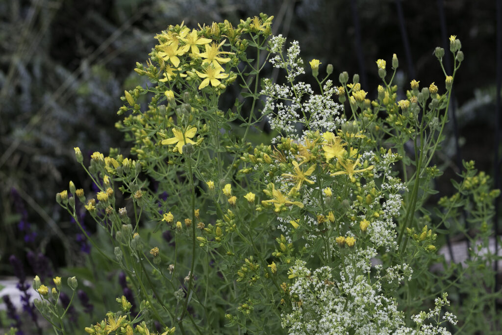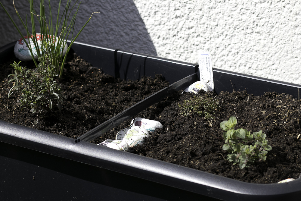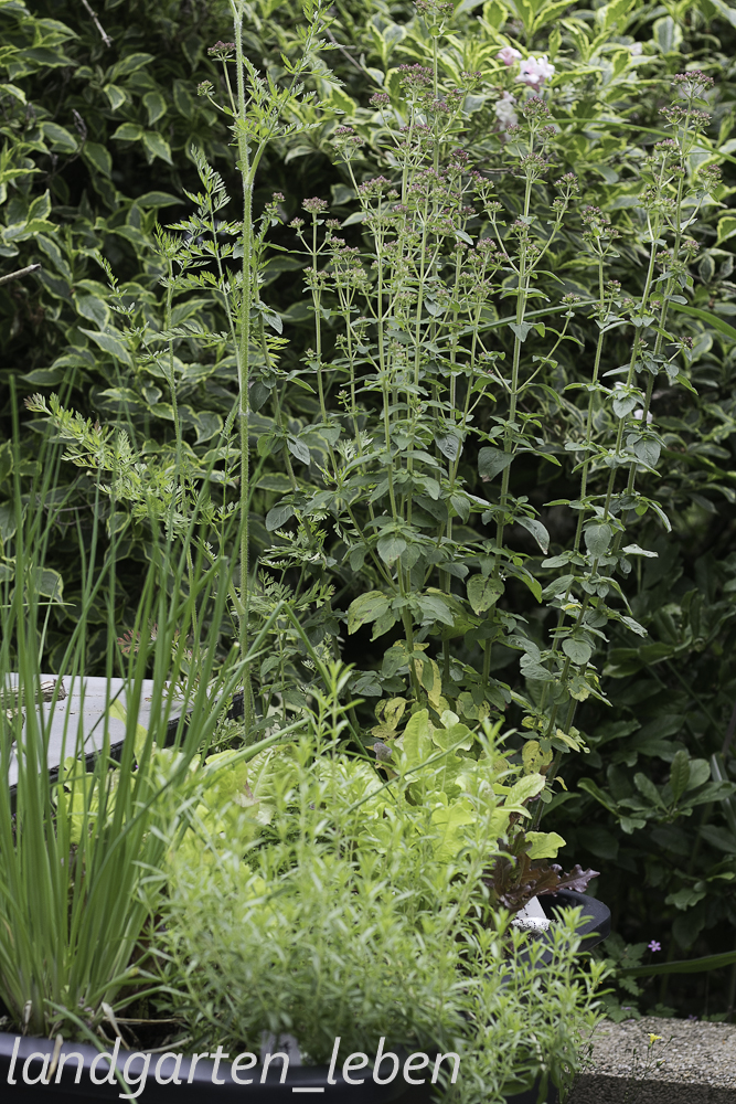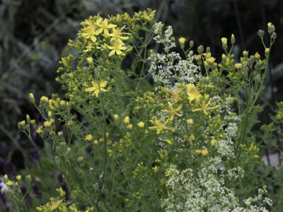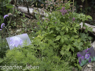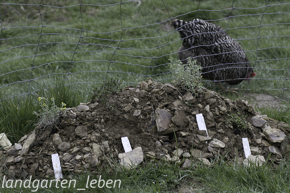 Neue Stauden: Berg-Steinkraut, Berg-Bohnenkraut, Wiesen-Schlüsselblume, Kleiner Mannstreu, Stockrose, Dost (Oregano), Wilder Majoran, Teppich Glockenblume, Fenchel und Thymian