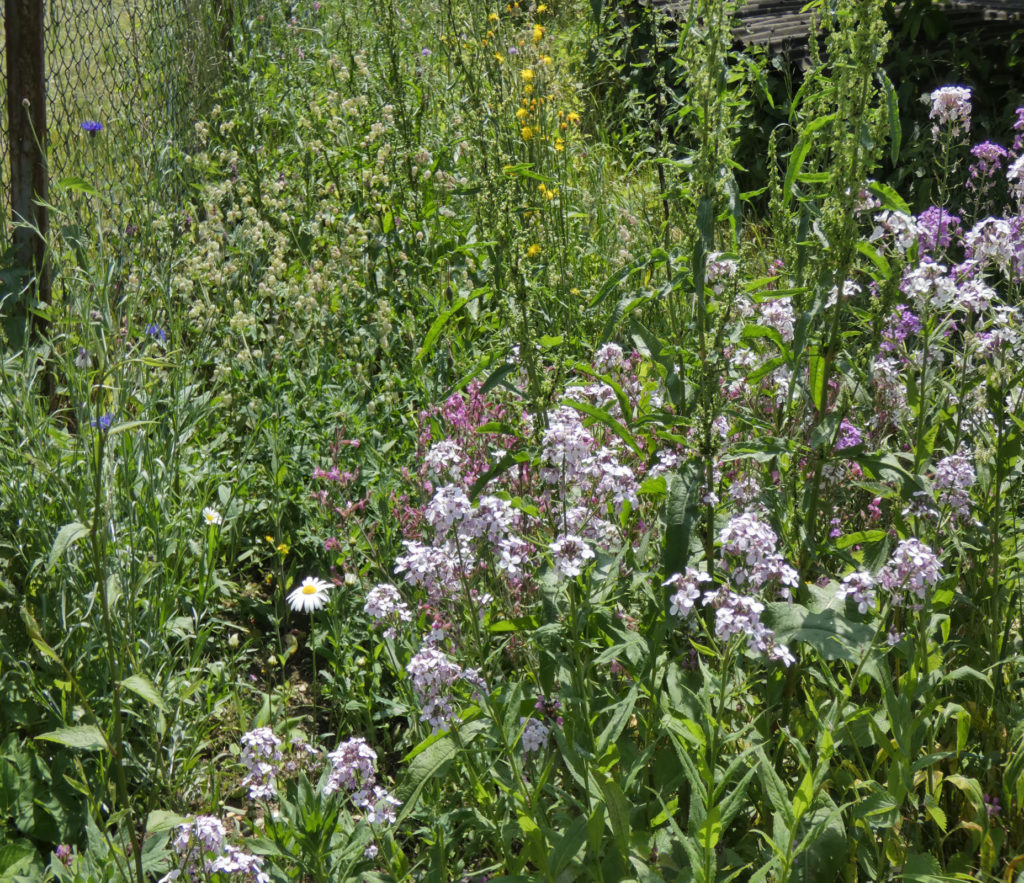 Das Zaunbeet ist mit verschiedenen Wildblumen bepflanzt, wie z.B. Wiesenmargarite, Klatschmohn, Kornblumen, Rote Lichtnelke, Wiesenpippau, Taubenkropfleimkraut, Nachtkerzen, Tausendgüldenkraut und Wiesenwitwenblumen. Im Moment werden die Blüten von Wildbienen besucht.