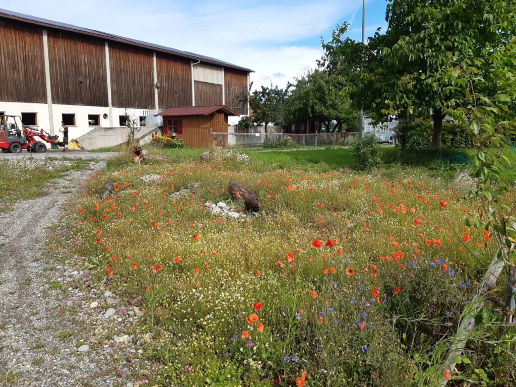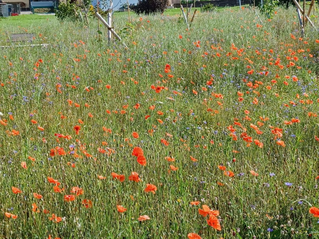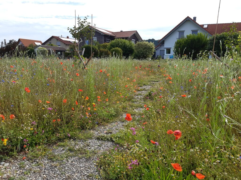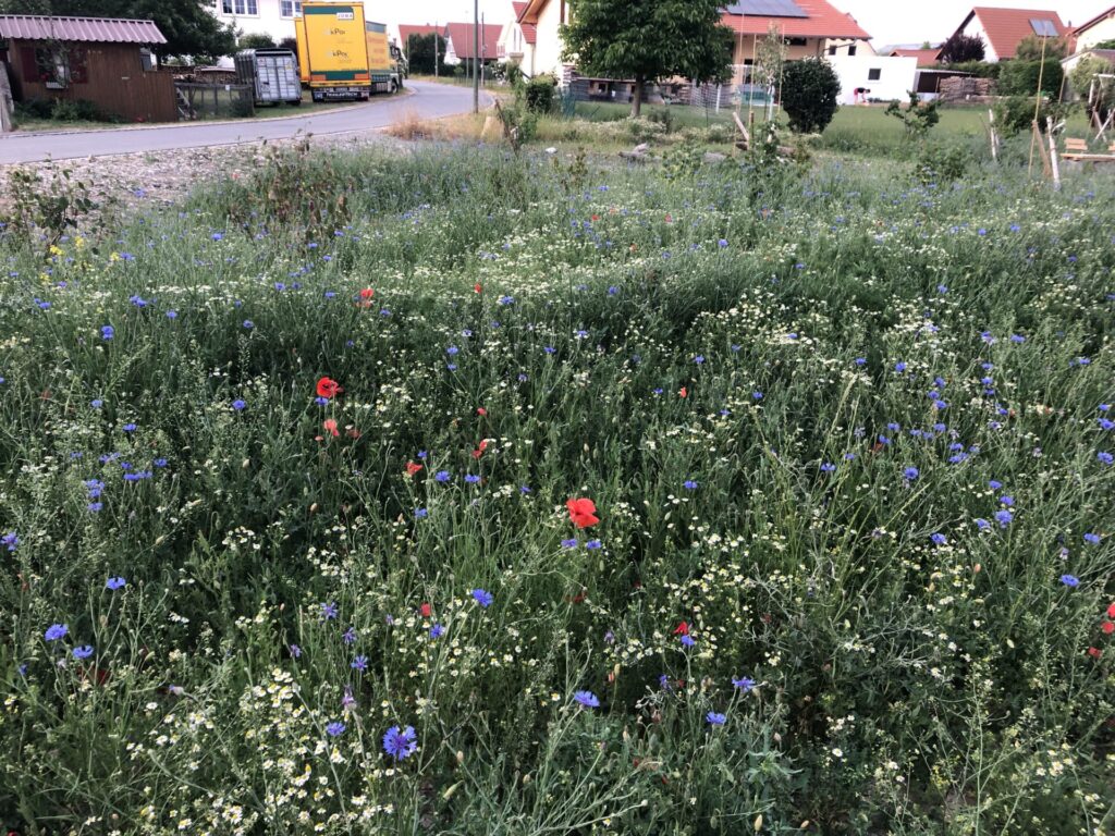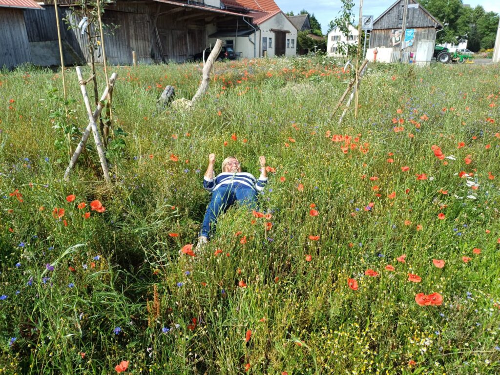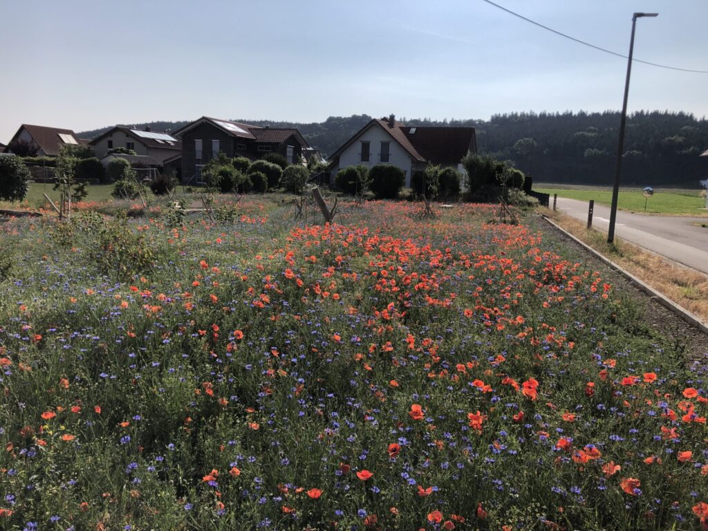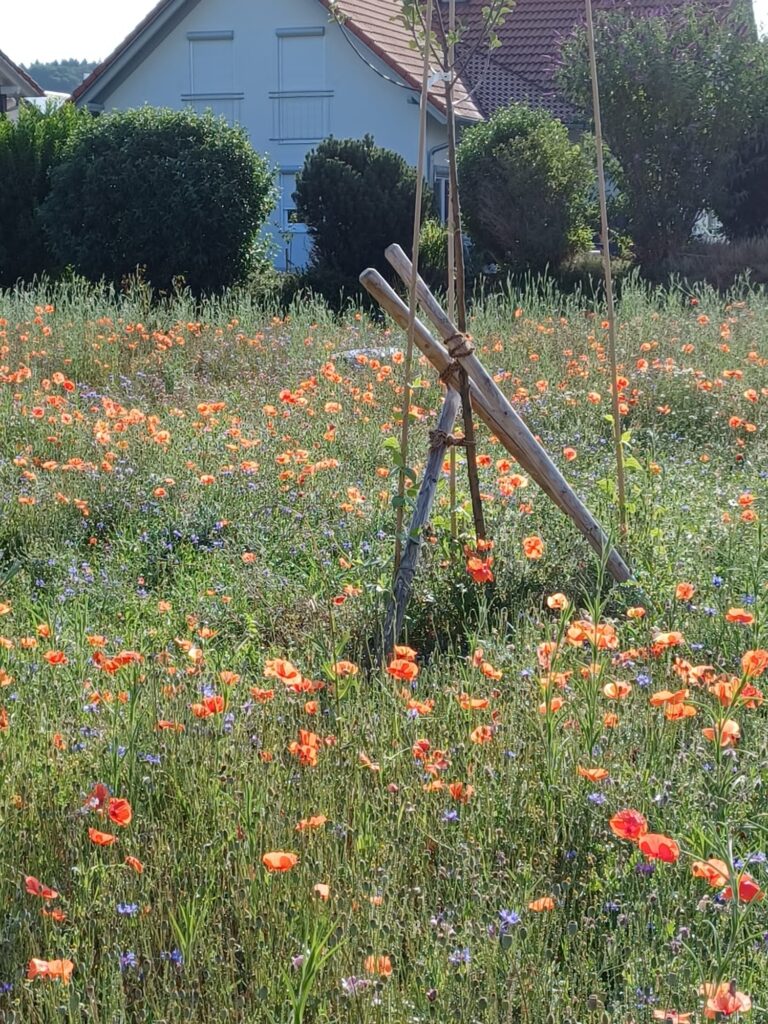 Die 13 Obstbäume, robuste Apfel, Birnen- und Zwetschgensorten, wurden im Dezember 2022 im Rahmen einer Baumpflanzaktion mit den Baumpaten gepflanzt. Anfang April 2023 erfolgte die Ansaat der Blühflächen mit ca. 70-80 Wildblumenarten. Für den kleinen Sitzplatz wurde eine geschwungene Bank zum Verweilen geschaffen. Mitte Mai wurden zur Bodenverbesserung auf den BAumscheiben Bohnen, Kapuzinerkresse, Buchweizen und Wicken ausgebracht. Zur Zeit genießen wir die Obstwiese mit allen Sinnen. Aktuell blühen Mohn- und Kornblumen und die Kamille duftet wunderbar. Die Blüte der Kornrade steht in den Startlöchern. Die nächsten Wochen werden wir den Totholz-Stapel erweitern, einen Kiesbereich mit Wildblumen ansäen und einen Teil der Blumenwiese mähen. Unglaublich wieviele Schmetterlinge, Hummeln, Bienen und andere Insekten nun hier ihren Lebensraum haben. Es macht viel Freude auf Entdeckungstour zu gehen und dem Treiben der vielfältigen neuen Bewohner dieses Grundstücks zuzusehen.