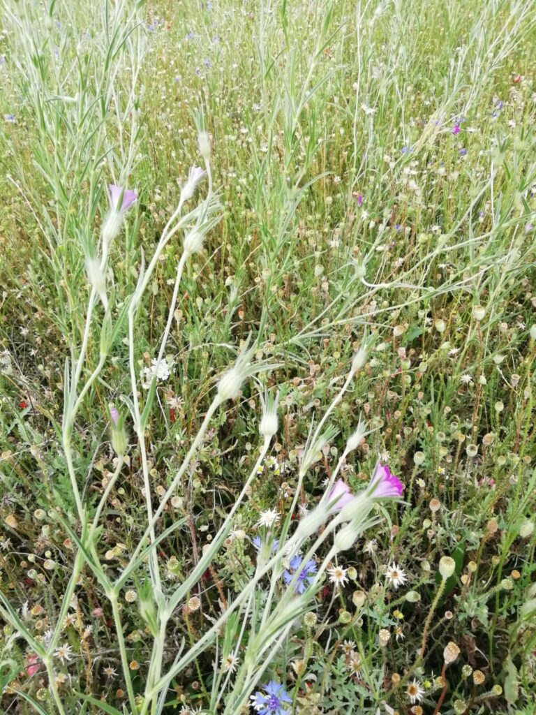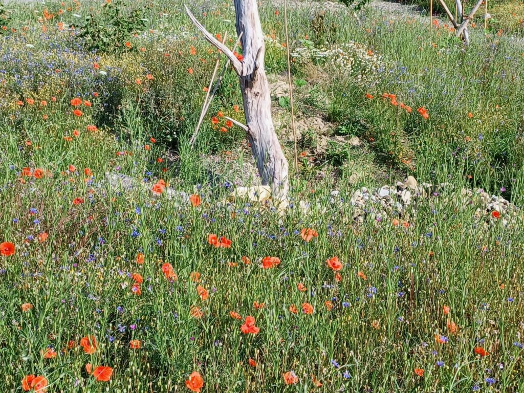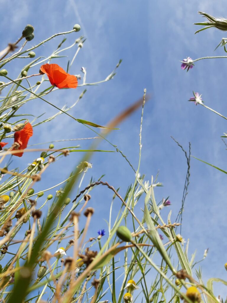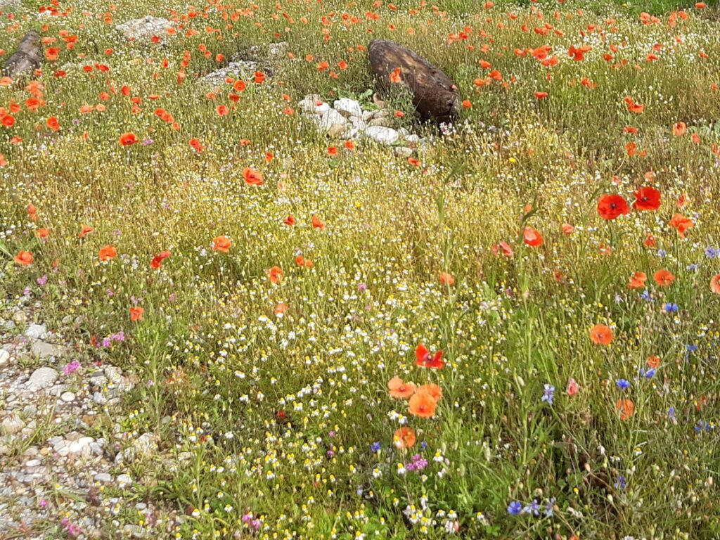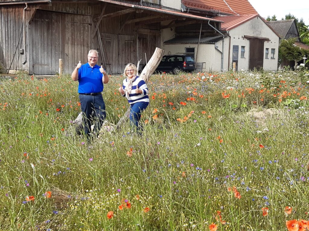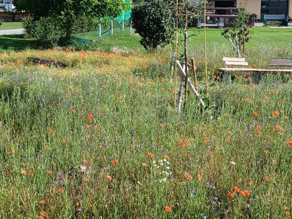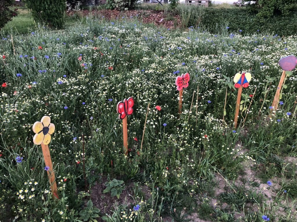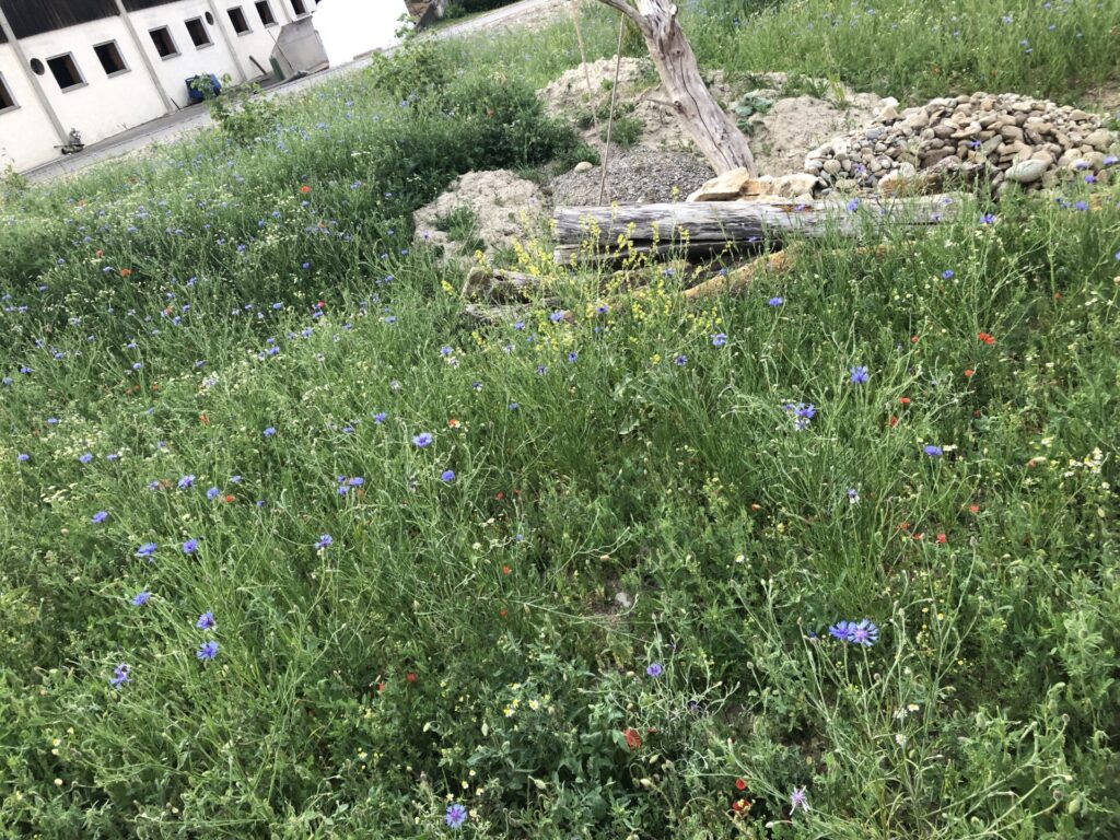 Die 13 Obstbäume, robuste Apfel, Birnen- und Zwetschgensorten, wurden im Dezember 2022 im Rahmen einer Baumpflanzaktion mit den Baumpaten gepflanzt. Anfang April 2023 erfolgte die Ansaat der Blühflächen mit ca. 70-80 Wildblumenarten. Für den kleinen Sitzplatz wurde eine geschwungene Bank zum Verweilen geschaffen. Mitte Mai wurden zur Bodenverbesserung auf den BAumscheiben Bohnen, Kapuzinerkresse, Buchweizen und Wicken ausgebracht. Zur Zeit genießen wir die Obstwiese mit allen Sinnen. Aktuell blühen Mohn- und Kornblumen und die Kamille duftet wunderbar. Die Blüte der Kornrade steht in den Startlöchern. Die nächsten Wochen werden wir den Totholz-Stapel erweitern, einen Kiesbereich mit Wildblumen ansäen und einen Teil der Blumenwiese mähen. Unglaublich wieviele Schmetterlinge, Hummeln, Bienen und andere Insekten nun hier ihren Lebensraum haben. Es macht viel Freude auf Entdeckungstour zu gehen und dem Treiben der vielfältigen neuen Bewohner dieses Grundstücks zuzusehen.