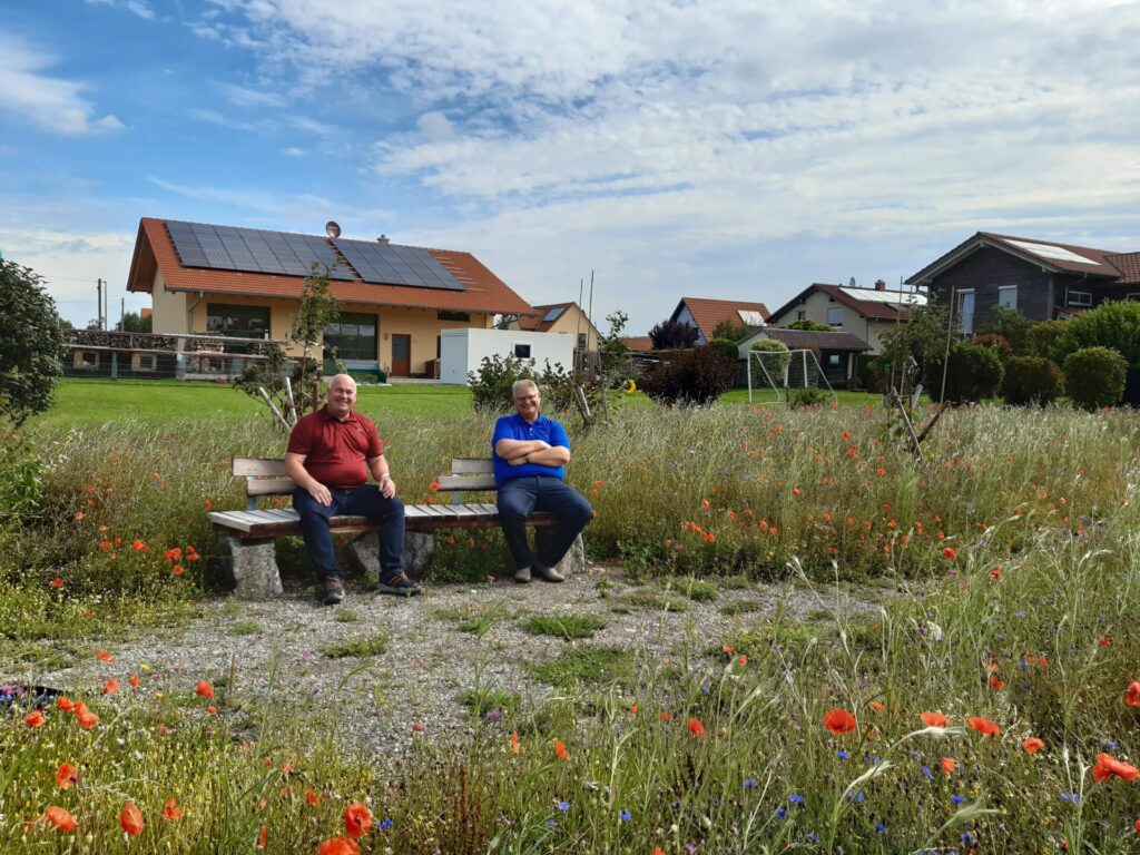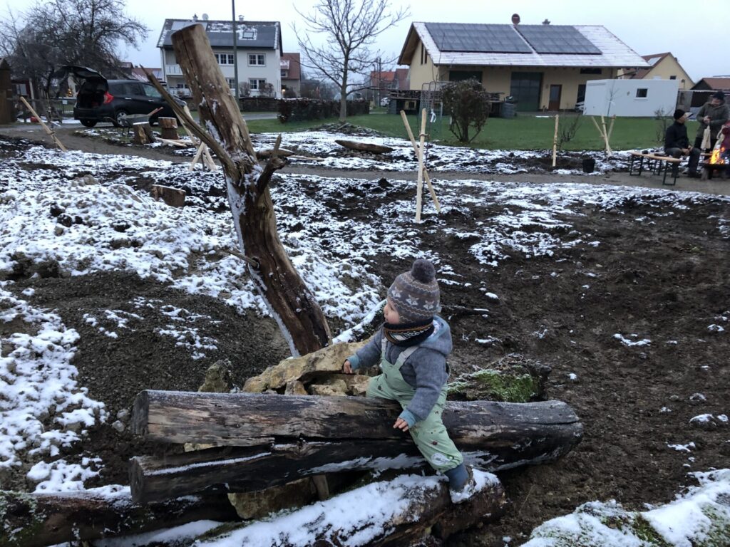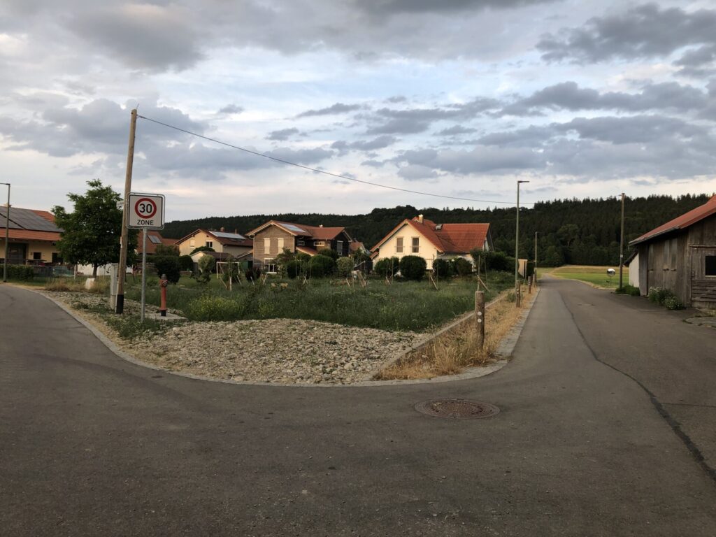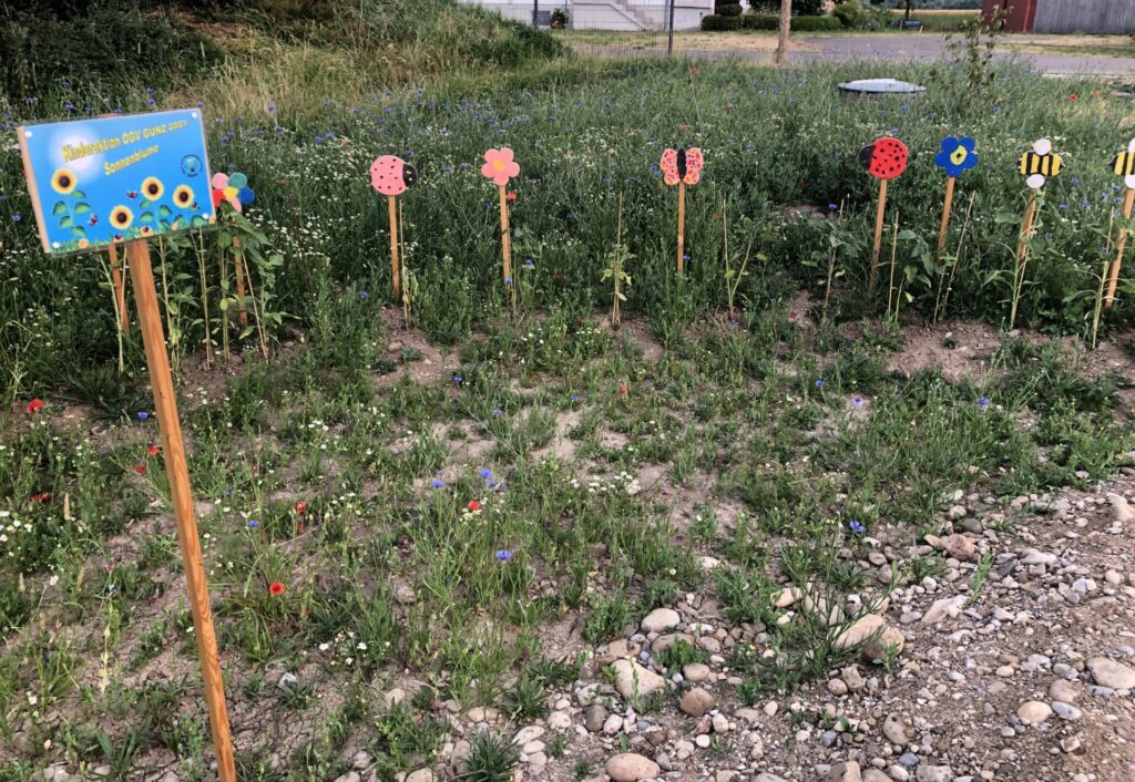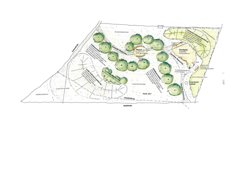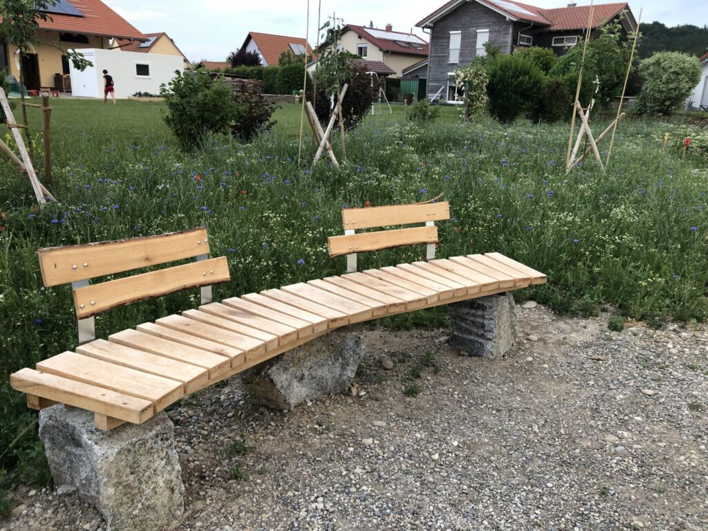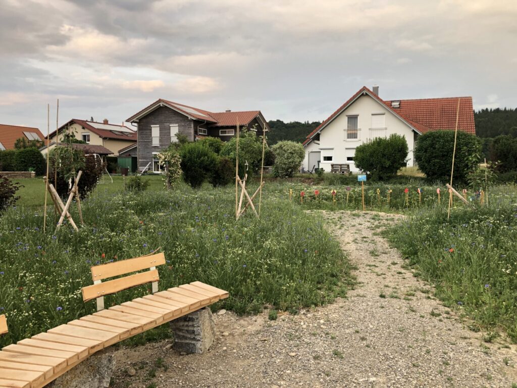 Für die freie Grünflache im Baugebiet war eigentlich eine klassische Obstwiese mit Hochstämmen angedacht. Als Naturgärtner Christof Wegner die Fläche sah, hatte er sehr schnell ein Bild des künftigen Naturraums vor Augen. Die Fläche sollte in das Umfeld eingebettet und dem Landschaftsbild, das die Ortschaft Günz, einen Ortsteil der Gemeinde Westerheim umgibt, angepasst werden. Er wollte die Natur ins Dorf zurückbringen und für alle erlebbar machen. Ein geschwungener Kiesweg schlängelt sich wie ein Bach durch den neuen Naturraum.