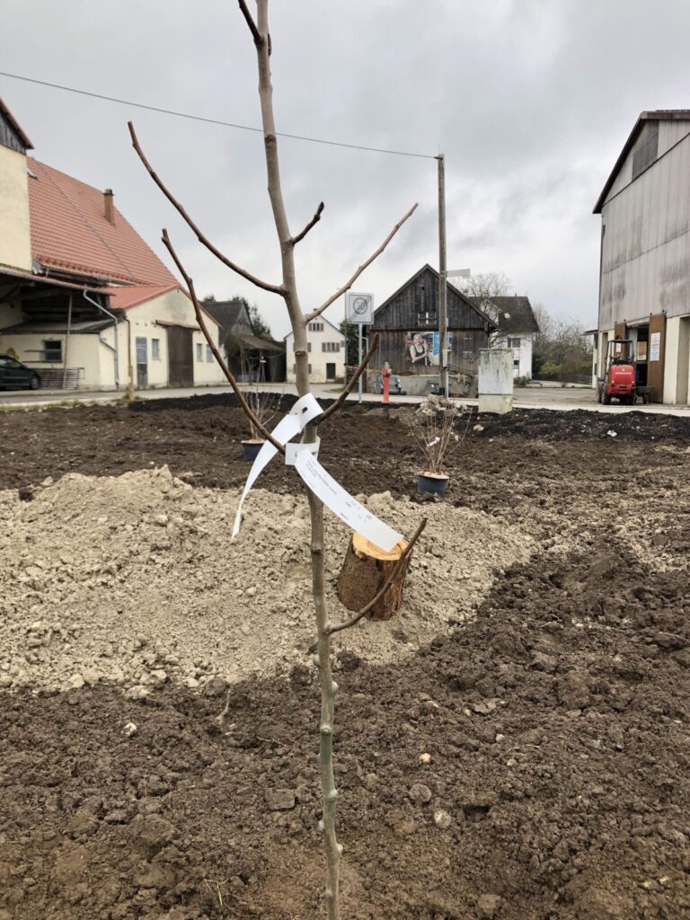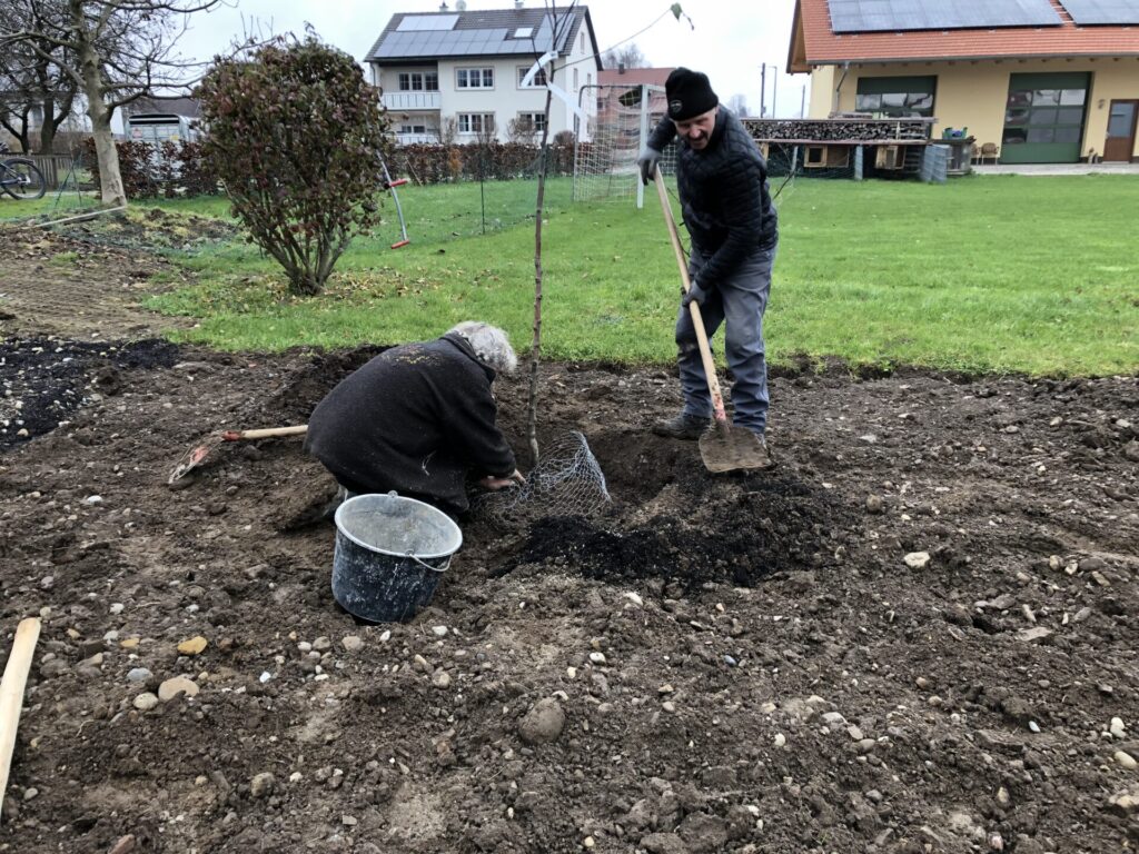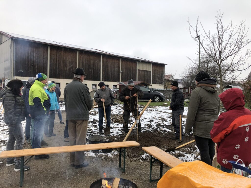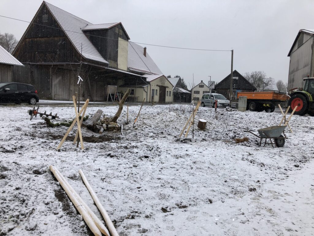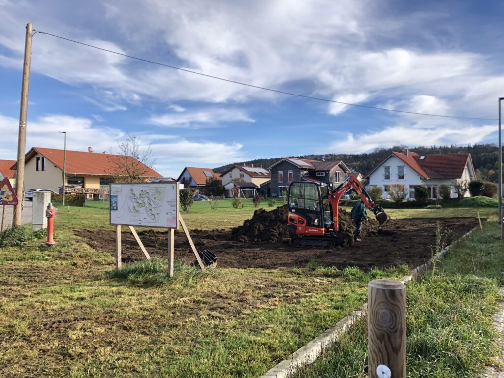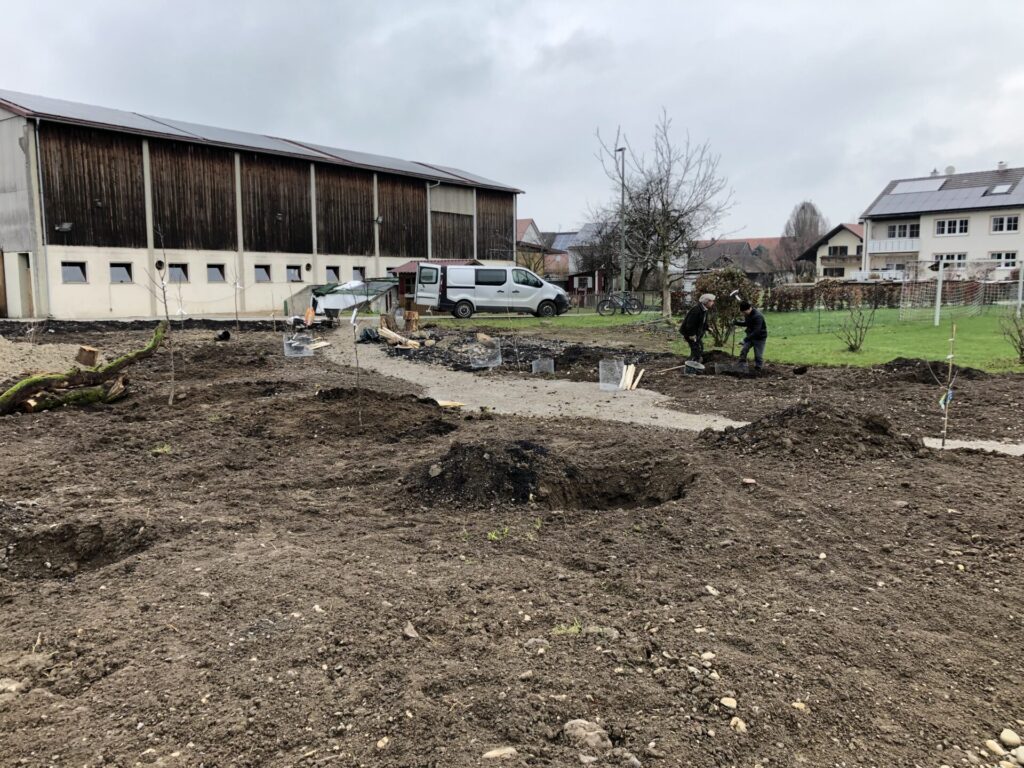 Der Oberboden wurde mit einem Minibagger abgezogen, tiefgründig gelockert und mehrere Erhebungen modelliert. Mit Unterstützung der Bauhofmitarbeiter, einiger Gemeinderäte sowie Mitgliedern des Gartenbauvereins wurden der Weg und ein kleiner Sitzplatz angelegt. Die Menschen sollen eingeladen werden, in den Obstgarten hinein zu gehen, oder dort mit Blick in die umgebende Landschaft zu verweilen. Zum Erhalt einer Vielzahl verschiedener Arten wurde ein Totholzhaufen und ein Sandbereich auf dem Gelände angelegt.