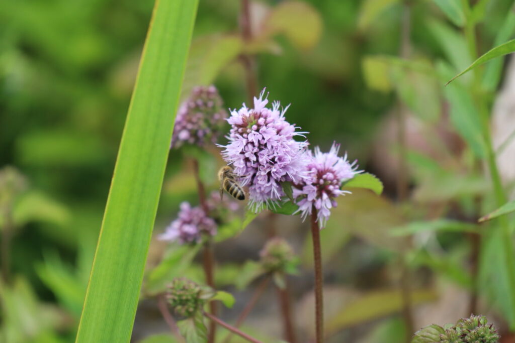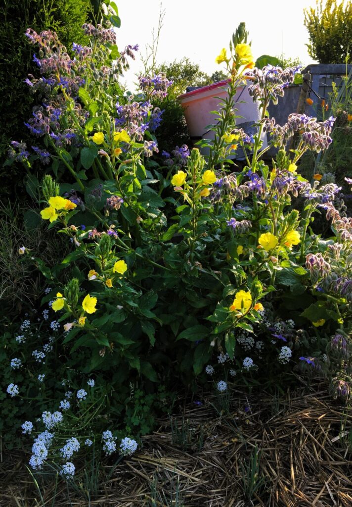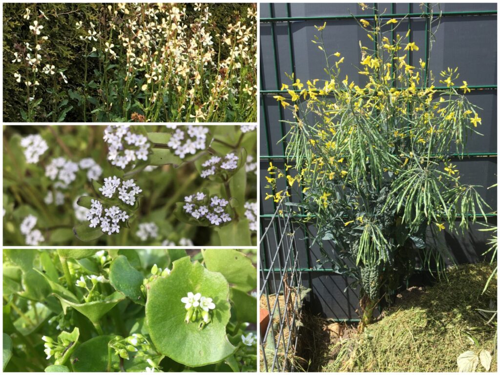 Kräuter (ich lasse alle blühen): Rosmarin, Thymian, Ysop, Pimpinelle, Schnittlauch, Oregano, Pfefferminze, Gewürzfenchel, Dill, Salbei, Basilikum, Zitronenmelisse, Strauchbasilikum, Petersilie, Bohnenkraut