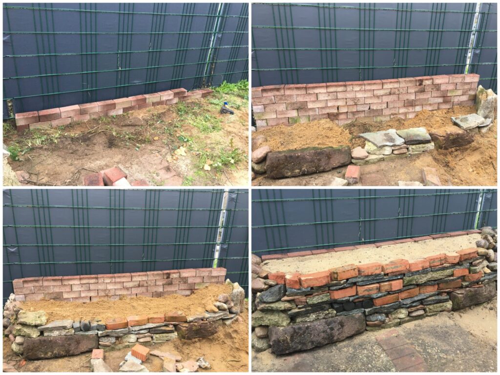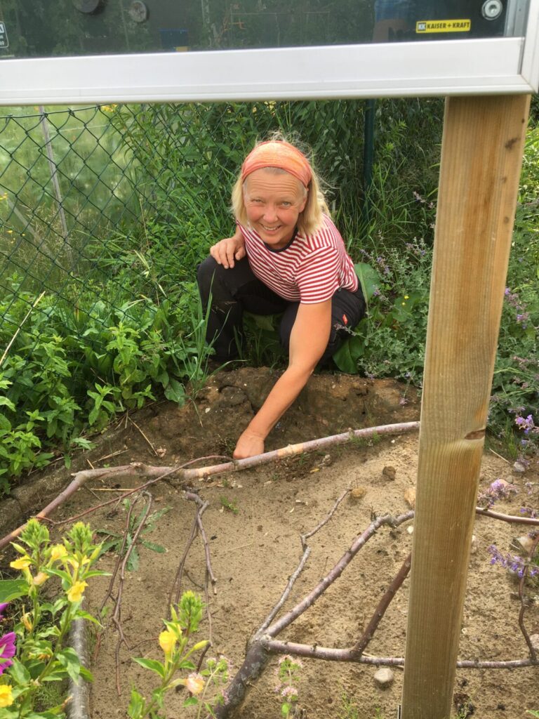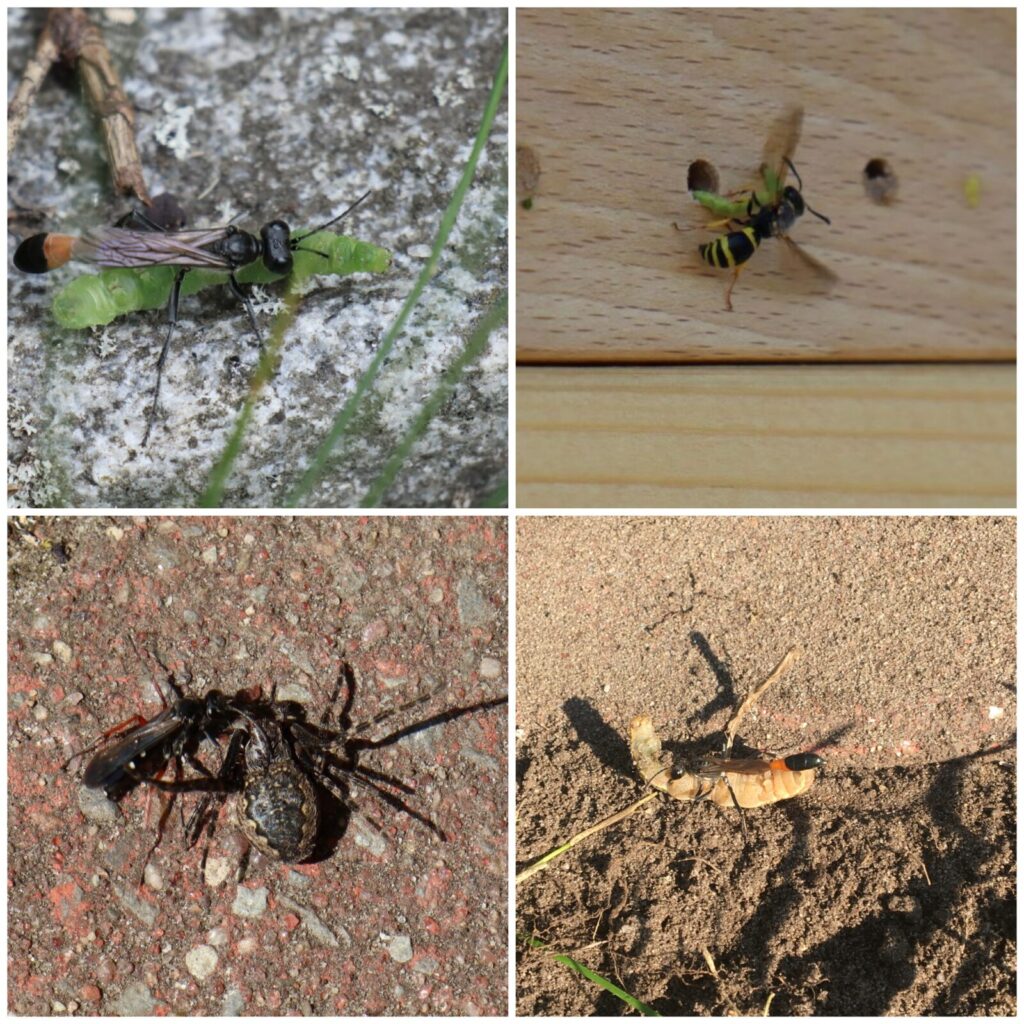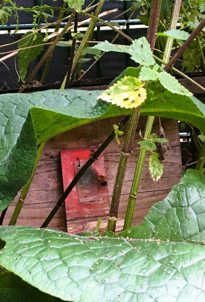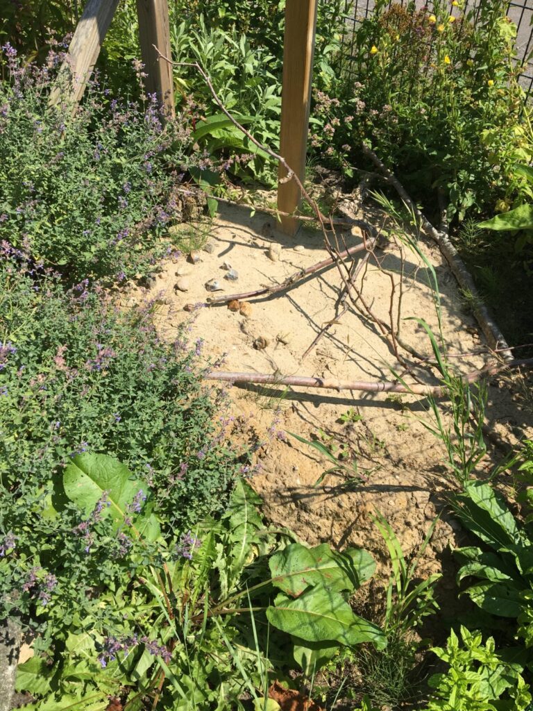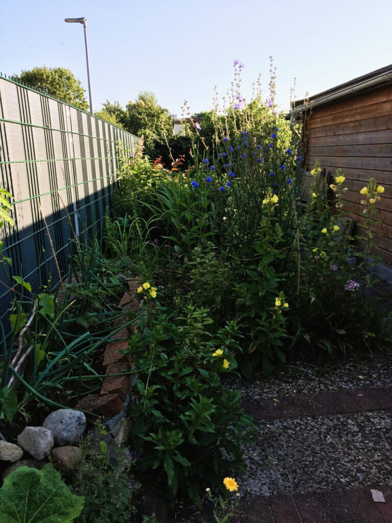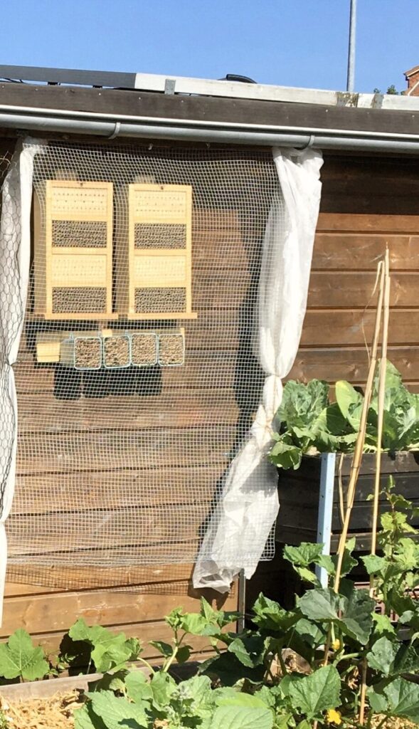 Da wir an keiner Seite des Gartens für die Bepflanzung zuständig sind und somit keine gemischte Hecke anlegen können, haben wir Sträucher in einem lockeren Verband gepflanzt und am Kompost ein immergrünes Geißblatt gesetzt, das nun super dicht eine weitere Trockenmauer überwächst. Der alte Pfaumenbaum der Nachbarin steht als Totholz und dicke Äste davon liegen in den Beeten verteilt, wo sich in diesem Jahr zum ersten Mal Totholz-Blattschneiderbienen eingenistet haben. Unser Garten bietet eine Vielzahl an Nistmaterialien und -möglichkeiten für Wildbienen, überall wird Holz abgeschabt, es gibt Lehm am Boden und als Steine in der Nisthilfe und wir entdecken immer wieder neue Plätze, an denen sich Wildbienen einquartieren, wie z.B. Blattschneiderbienen unter dem Dach der Hütte oder Sandbienen in den Fugen hinter der Geräteschuppentür. Oder es schaut einen plötzlich eine kleine Biene aus einem Loch im Rasen an. Spannend zu sehen ist, wenn dadurch die natürliche Schädlingsabwehr tatsächlich funktioniert und wir eine Sandwespe mit Raupe auf dem Weg zu ihrer Nisthöhle beobachten dürfen und unzählige Marienkäfer die Blattläuse wegfuttern.