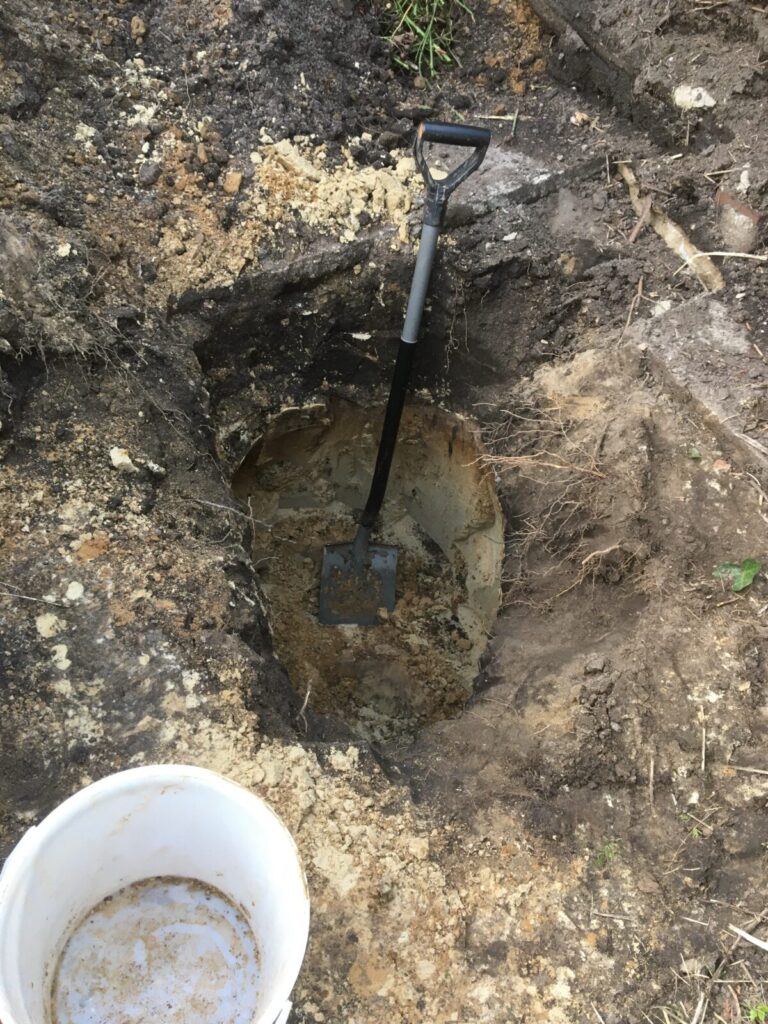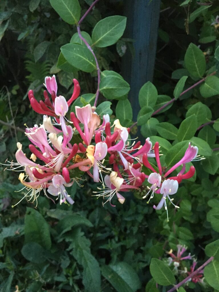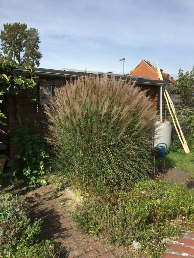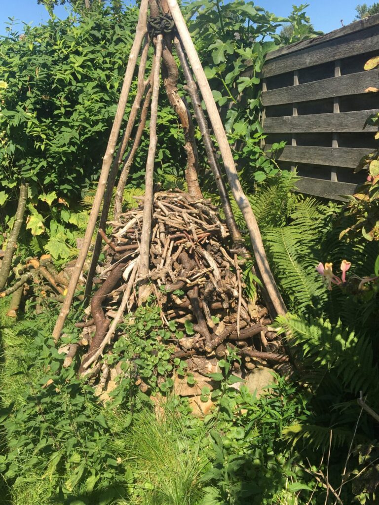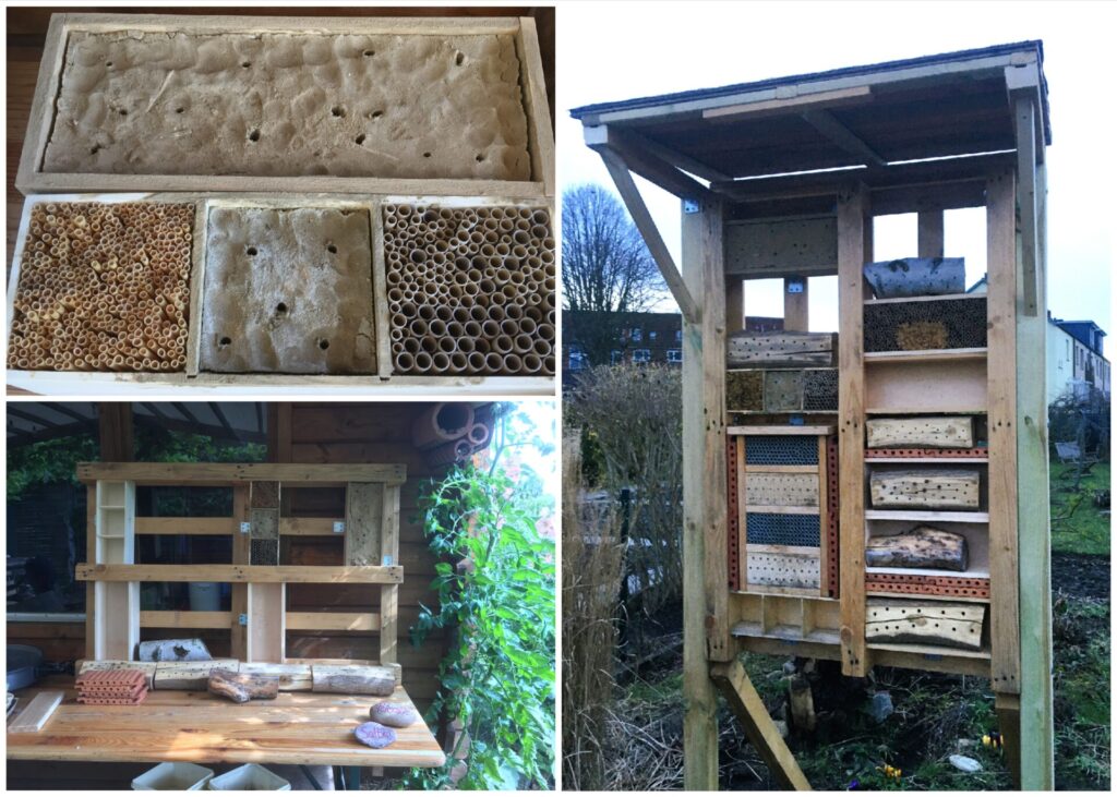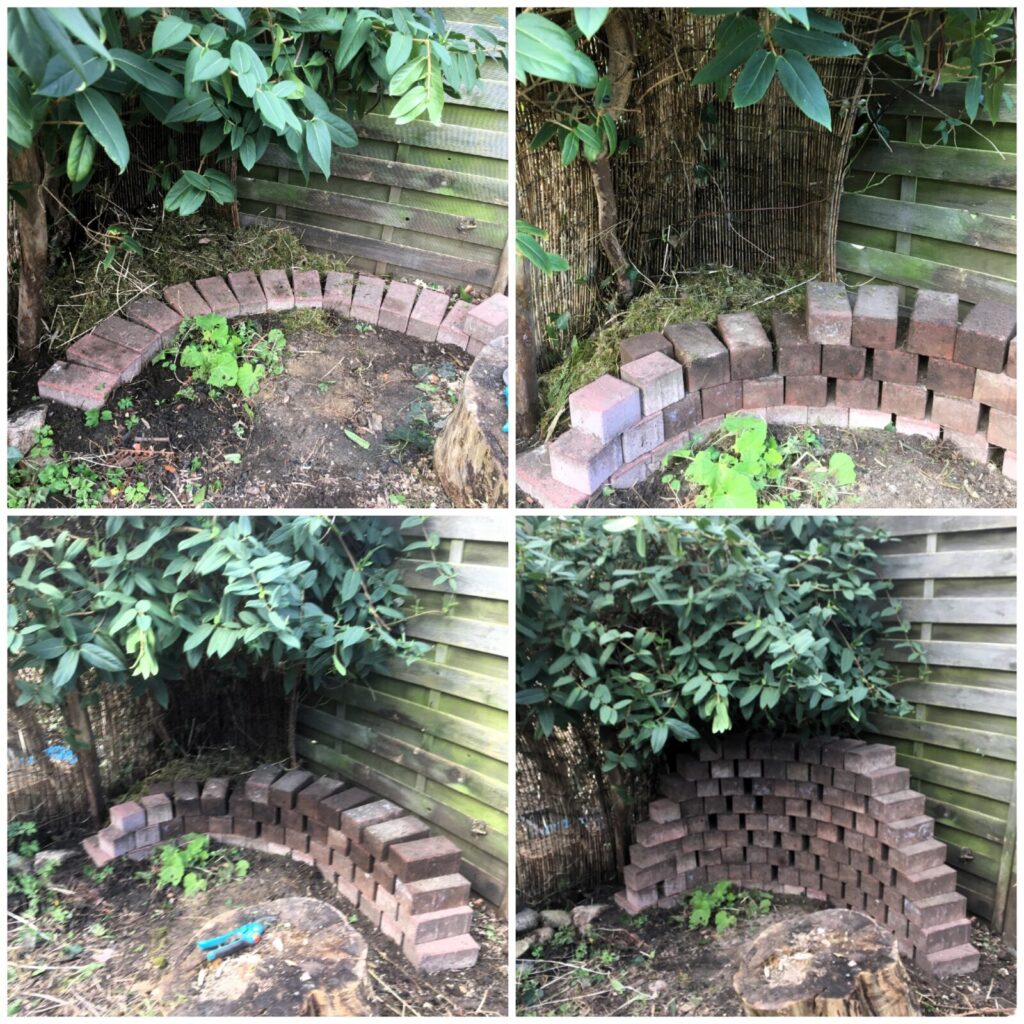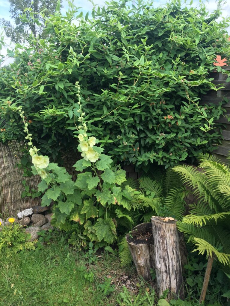 Da wir an keiner Seite des Gartens für die Bepflanzung zuständig sind und somit keine gemischte Hecke anlegen können, haben wir Sträucher in einem lockeren Verband gepflanzt und am Kompost ein immergrünes Geißblatt gesetzt, das nun super dicht eine weitere Trockenmauer überwächst. Der alte Pfaumenbaum der Nachbarin steht als Totholz und dicke Äste davon liegen in den Beeten verteilt, wo sich in diesem Jahr zum ersten Mal Totholz-Blattschneiderbienen eingenistet haben. Unser Garten bietet eine Vielzahl an Nistmaterialien und -möglichkeiten für Wildbienen, überall wird Holz abgeschabt, es gibt Lehm am Boden und als Steine in der Nisthilfe und wir entdecken immer wieder neue Plätze, an denen sich Wildbienen einquartieren, wie z.B. Blattschneiderbienen unter dem Dach der Hütte oder Sandbienen in den Fugen hinter der Geräteschuppentür. Oder es schaut einen plötzlich eine kleine Biene aus einem Loch im Rasen an. Spannend zu sehen ist, wenn dadurch die natürliche Schädlingsabwehr tatsächlich funktioniert und wir eine Sandwespe mit Raupe auf dem Weg zu ihrer Nisthöhle beobachten dürfen und unzählige Marienkäfer die Blattläuse wegfuttern.
