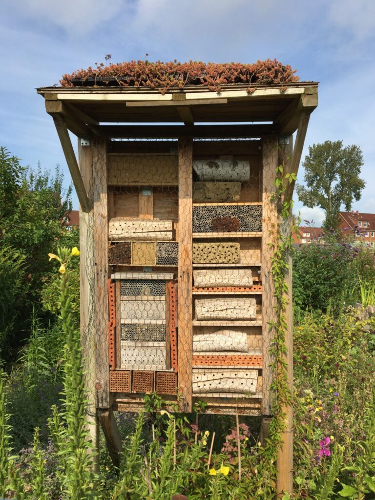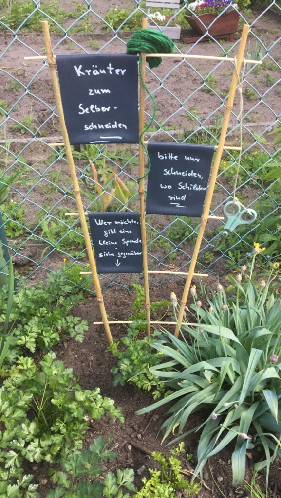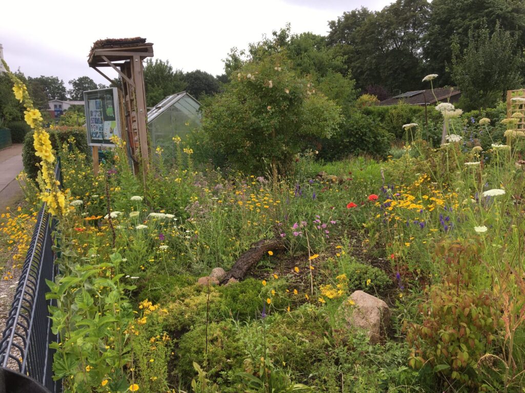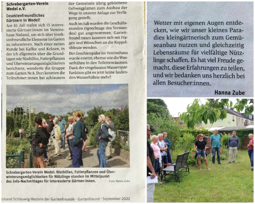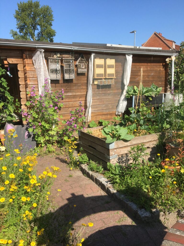 Und nun zieht unser Engagement Kreise. Da unser Garten ein echter Hingucker ist, kommt es immer wieder zu Gesprächen am Zaun mit Spaziergängern und unseren Mitgärtnern. Wurden wir zu Anfang noch etwas skeptisch beäugt, finden wir mittlerweile großen Zuspruch und sind in einem stetigem Austausch über erfolgreiches, naturnahes Gärtnern. Zweimal im Jahr bieten wir den Tag des offenen Törchens an, wo viele Besucher vorbeikommen, um sich zu informieren und wir uns mit den Schrebern aus anderen Kolonien in Wedel vernetzen. So wächst nicht nur das Gemüse sehr gut, sondern auch die Gemeinschaft von naturnahen Mitstreitern. Da wir überschüssiges Gemüse über einen Korb am Zaun verschenken oder gegen Spende abgeben, entstand ein Kontakt zum Kinderschutzbund in Wedel, an den wir das Geld weiterleiten. Mit dessen engagierter ersten Vorsitzenden Bonny Redelstorff haben wir in diesem Jahr ein Gartenprojekt für Grundschüler ins Leben gerufen. Mit vier begeisterten Zweitklässlerinnen gärtnern wir nun montags nachmittags und bringen ihnen so nebenbei die Bedeutung der Insektenwelt nahe. Bei Instagram haben wir zwei Profile (garten_nr.8 und galerie_garten_nr.8), auf denen wir über unser Tun berichten und auch das regelmäßige Posten vom Fotos und Videos über unsere Entdeckungen im Status von WhatsApp gibt uns immer wieder positive Rückmeldungen und erreicht viele Menschen.