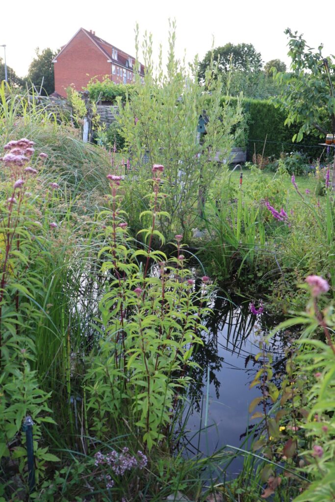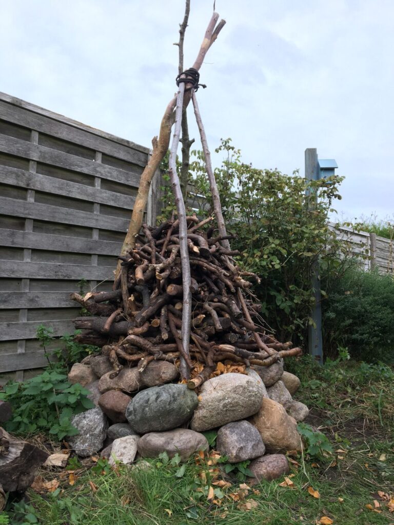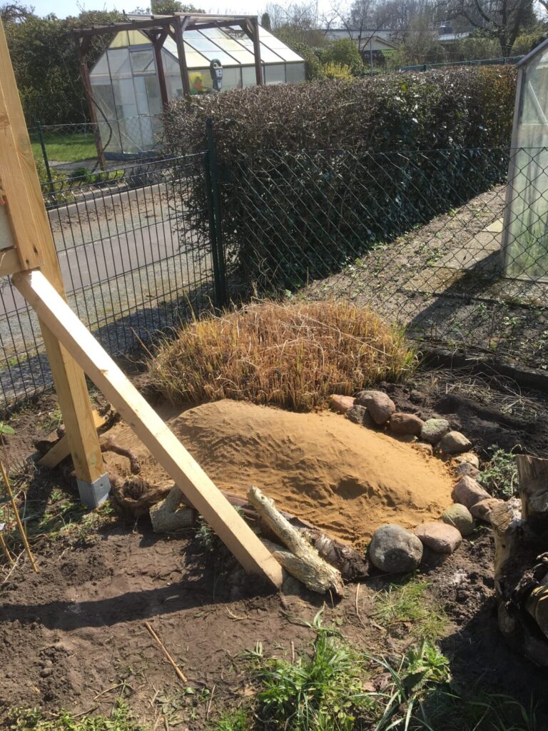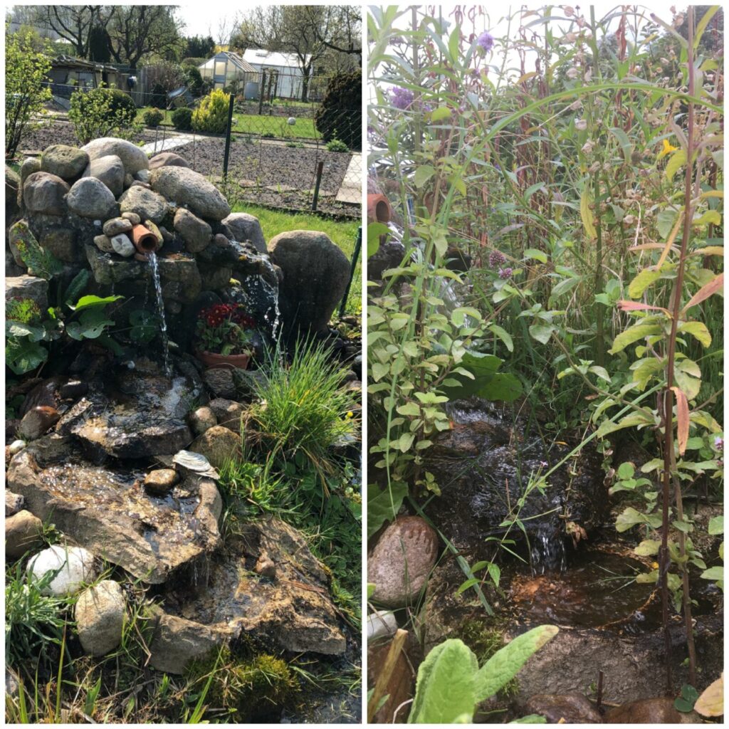 Wenn wir schon mit einigen Maßnahmen (kleine Nisthilfe, Totholz, Wildblumenbeet) für insektenfreundlichen Gärtnern gestartet waren, hat uns die große Begeisterung für Insekten spätestens nach der Teilnahme am Wettbewerb des Landesverbandes S-H der Gartenfreunde 'Hungriges Insekt sucht Biene mit Blüte' 2020 gepackt. Inzwischen ist jeder Bereich des Gartens so umgestaltet, dass er einen Nutzen für Insekten und natürlich auch andere Wildtiere bietet. Die Steine auf den Wegen haben wir gegen Holzhäcksel ausgetauscht. Wir haben Sträucher wie Zaubernuss, Weißdorn, Haselnuss und Kornelkirsche gepflanzt und vom Frühjahr bis in den Herbst hinein blüht immer etwas. Gegenüber von den Gemüsebeeten haben wir eine größere Fläche für Wildblumen und -stauden angelegt. Hier drin befindet sich ein großer Lesesteinhaufen und einiges liegende Totholz. Offene Stellen bieten hier bodenbrütenden Wildbienen Raum, wobei diese sich auch im ganzen Garten selbstverständlich ihre Plätze suchen. Seit diesem Jahr gibt es vorne in der Ecke des Beetes ein Sandarium, für das ein mächtiges Ziergras weichen musste. Direkt daneben haben wir eine selbst gebaute Nisthilfe und einen Schaukasten aufgestellt, um über insektenfreundliches Gärtnern zu informieren. Am Teich haben wir einen Wasserlauf gestaltet, der durch Spritzwasser immer für ein feuchtes Biotop sorgt. Es gibt viel Moos am Rand des Wassers, wo Bienen sicher trinken können. Am anderen Ende haben wir die 'Molchhöhle' angelegt, eine Grube, die nicht nur diesen Tieren Schutz im Winter geben soll, sondern die auch gerne von Hummeln im Sommer besiedelt wird. Unsere zwei Rasenflächen mähen wir im Wechsel, so daß die verschiedenen Kräuter darin immer ein Blühangebot bieten. Hinter der Hütte gibt es unsere wilde Ecke. Nachdem wir dort das Fundament der alten Hütte ausgegraben haben, überlassen wir diese Fläche sich selbst. Ein kleiner Teich versteckt sich hier und es bietet sich jedes Jahr ein anderes Bild. Im Anschluß daran kommt der Kompost, auf dem der Kürbis sich breit macht und dann geht es um die Ecke zur 'Igelburg'.