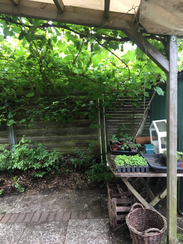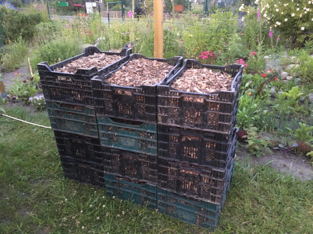 Schrebern heißt für mich, Gemüse und Obst anzubauen und dann voller Freude zu ernten! Auf ca. 90 qm startete ich mit dem Gemüsegarten im vorderen Bereich, sichtbar vom Weg aus. Ich baue unser Gemüse nach dem Prinzip der Mischkultur mit Fruchtfolge und -wechsel an, wobei ich nach Möglichkeit auf samenfeste, ökologische Sorten achte. Selbstverständlich verzichte ich auf Insektizide, Pestizide und mineralischen Dünger. Gesunder Boden - gesunde Pflanze. Den Boden baue ich mit eigenem Kompost, Gründüngung und verschiedenen Mulchmaterialien auf. Jede Fläche ist immer bedeckt, 'schwarze Acker' gibt es bei uns nicht. Mittlerweile verzichte ich ganz aufs Umgraben. Muss der Boden tiefer gelockert werden, benutze ich eine Broadfork, ansonsten wird nur in den oberen Schichten gehackt. An den Rändern und Ecken der Beete dürfen sich u.a. Ringelblumen, Borretch und Bartnelken aussamen. Kräuter wie Thymian und Schnittlauch rahmen die Beete ein und kommen natürlich zur Blüte und Aussaat. Durch das Mulchen wächst wenig Unkraut, das ich dann aber auch jäte. Wir starten die Ernte unseres eigenen Gemüses mittlerweile im April mit dem grünen Spargel und schließen mit dem letzten Grün- und Rosenkohl im Februar/März. Viele Kulturen lasse ich zur Blüte kommen, um eigenes Saatgut zu gewinnen und um ein weiteres Angebot für die Insekten zu bieten. So ziehe ich z.B. den schießenden Grünkohl mitsamt dem Wurzelballen heraus und setze ihn hinten auf dem Kompost, wo er abblühen kann.